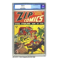 Zip Comics #7 (MLJ, 1940) CGC VG/FN 5.0 Off-white to white pages. Charles Biro cover. Biro, Irv Novick, and Mort Meskin art. Overstreet 2003 VG 4.0 value = $244; FN 6.0 value = $366. Important notice: Heritage usually auctions material at the rate of 200-250 lots per hour. On some occasions eBay Live bid software or the Internet may not be able to keep up with the pace of the auction. We recommend placing a realistic absentee bid now as insurance to avoid disappointment. Occasionally the auctioneer may eliminate or reject an eBay Live bid, and the auctioneer may also reopen a lot after the close of the eBay live bidding (usually because we missed an audience bid), and may reject your bid even if it shows you as the winning bidder. By bidding via eBay Live, you agree that Heritage may award the lot to another bidder at its sole discretion under the circumstances described above or any other reasonable circumstances. Since eBay bids are not shown to us until we open the lot on the floor, we treat those bids just like floor bids. In most cases the floor responds before the eBay bid is presented to us, due to Internet lag time, so for consistency we have made it a policy that floor bids are always considered first over tie eBay live bids. Also please note that all Heritage lots purchased through eBay Live carry a 20% Buyer's Premium. Please make sure you read the Terms and Conditions before you bid.