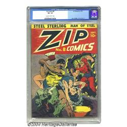 Zip Comics #8 (MLJ, 1940) CGC FN- 5.5 Off-white to white pages. Charles Biro cover. Biro, Irv Novick, and Mort Meskin art. Overstreet 2003 FN 6.0 value = $366. Important notice: Heritage usually auctions material at the rate of 200-250 lots per hour. On some occasions eBay Live bid software or the Internet may not be able to keep up with the pace of the auction. We recommend placing a realistic absentee bid now as insurance to avoid disappointment. Occasionally the auctioneer may eliminate or reject an eBay Live bid, and the auctioneer may also reopen a lot after the close of the eBay live bidding (usually because we missed an audience bid), and may reject your bid even if it shows you as the winning bidder. By bidding via eBay Live, you agree that Heritage may award the lot to another bidder at its sole discretion under the circumstances described above or any other reasonable circumstances. Since eBay bids are not shown to us until we open the lot on the floor, we treat those bids just like floor bids. In most cases the floor responds before the eBay bid is presented to us, due to Internet lag time, so for consistency we have made it a policy that floor bids are always considered first over tie eBay live bids. Also please note that all Heritage lots purchased through eBay Live carry a 20% Buyer's Premium. Please make sure you read the Terms and Conditions before you bid.