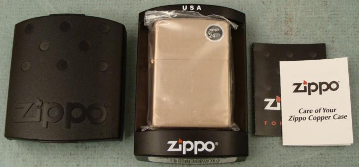 This Zippo lighter has a brushed finish copper case.It is in Mint condition in the original plastic box, still sealed in plastic, with paperwork too. It is model 161 REB BR FIN.