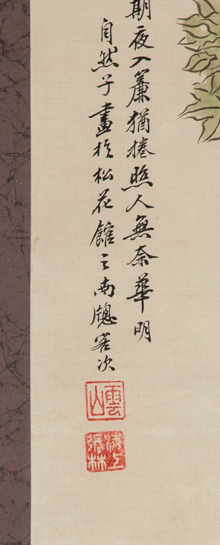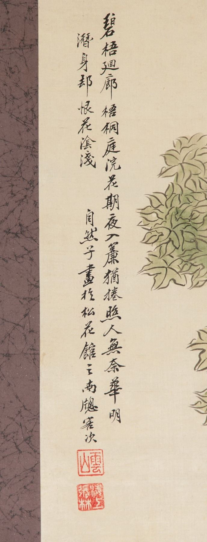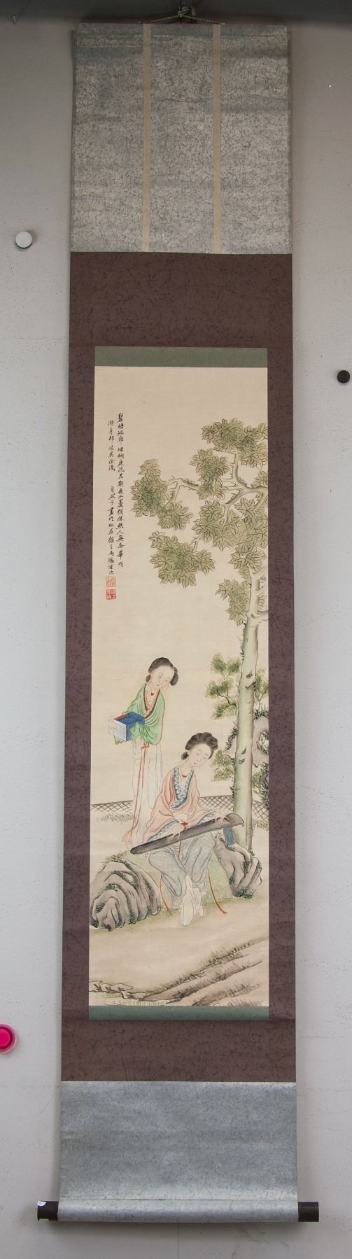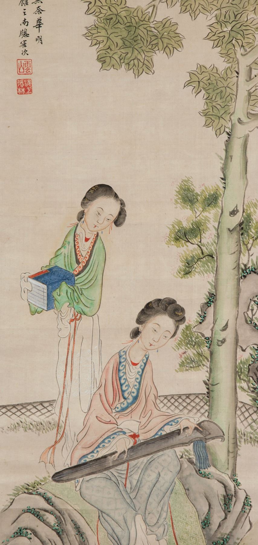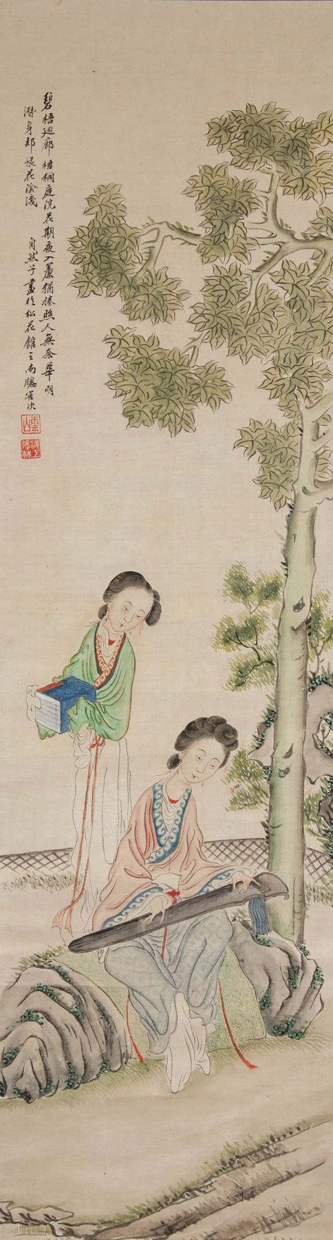 Painting of two beauties; Chinese ink and watercolour on paper; hanging scroll; signed Ziranzi; inscribed with 2 artist seals; 16th-18th century; 94 cm x 26 cm