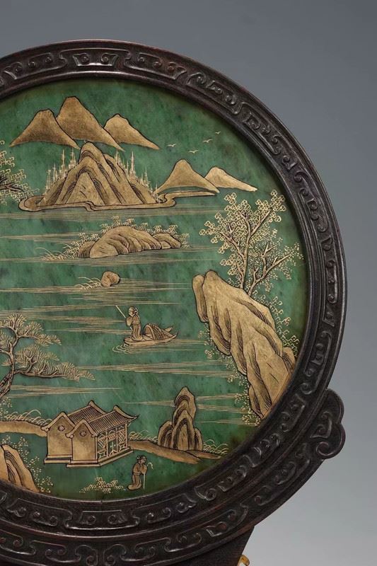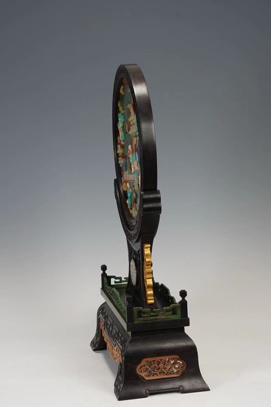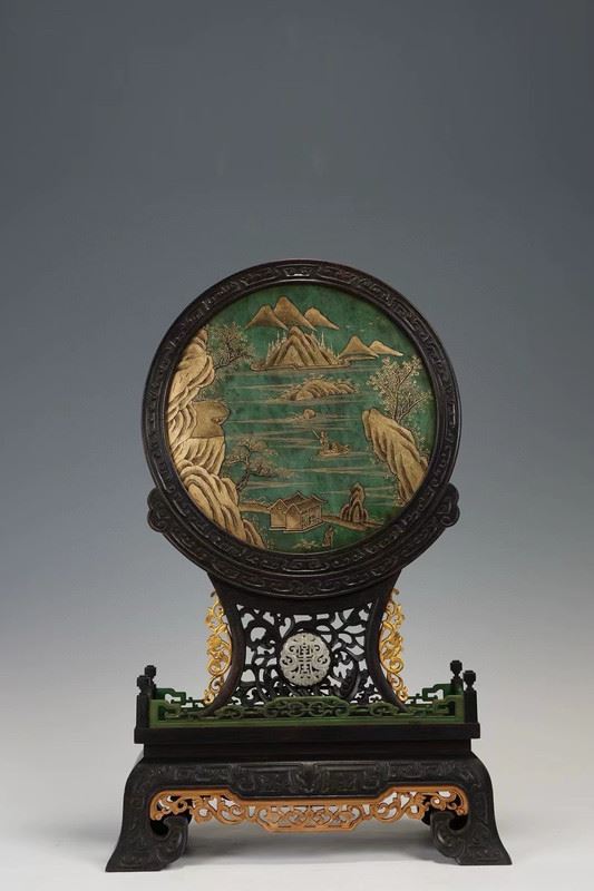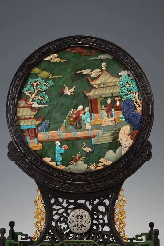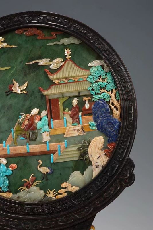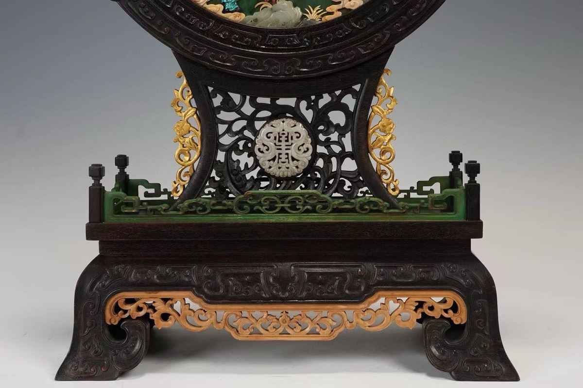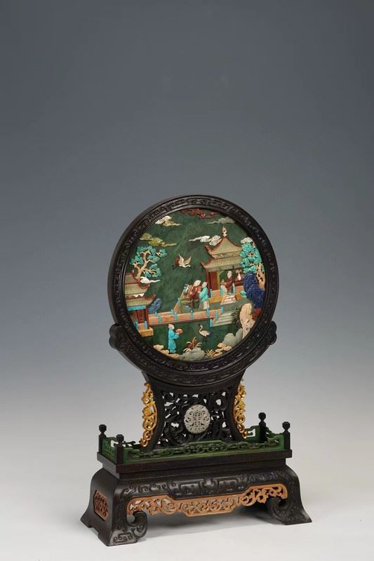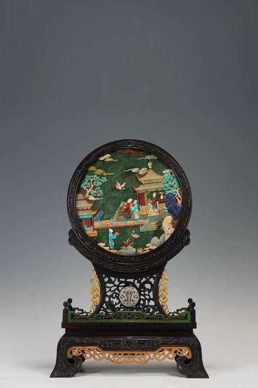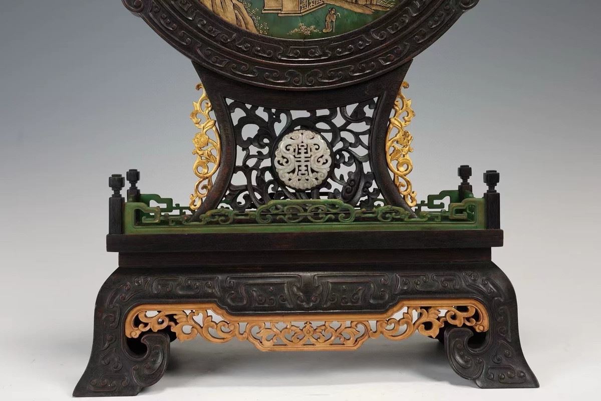 This Zitan wood inlaid screen showcases exceptional carving craftsmanship, depicting a vivid landscape with figures. The scene, featuring pavilions, flying birds, and figures, captures the elegance and tranquility of ancient gardens. The deep tones of Zitan wood complement the exquisite inlay work, with the wood's lustrous sheen and the fine details of the carvings enhancing each other. The intricately carved base adds depth and classical beauty, making this piece a valuable art treasure that combines both artistic and cultural significance.