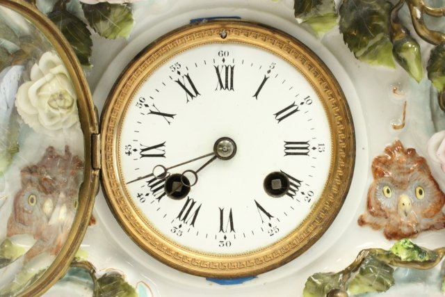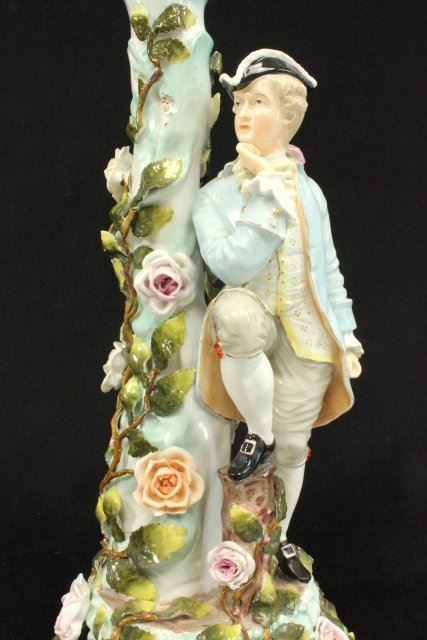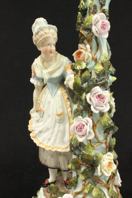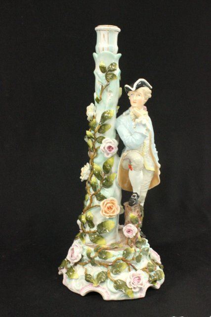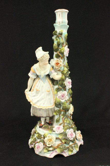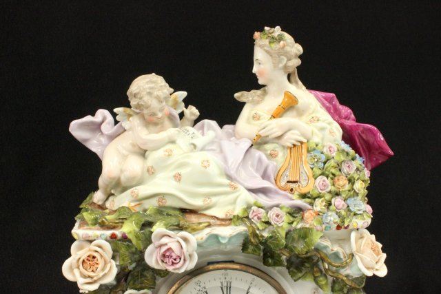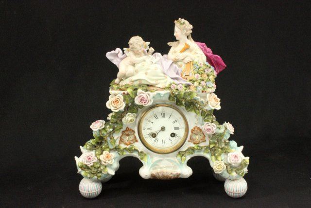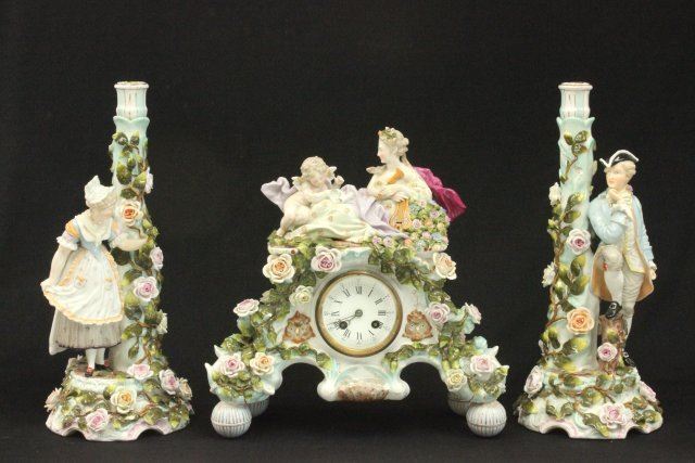 19th century figural set. Clock approx. 14 1/2" H. Candlesticks approx. 17" H. Minor flakes. Candlesticks originally had candelabra tops.