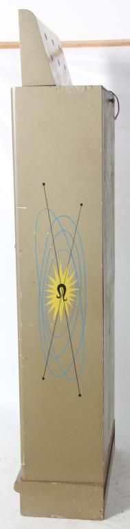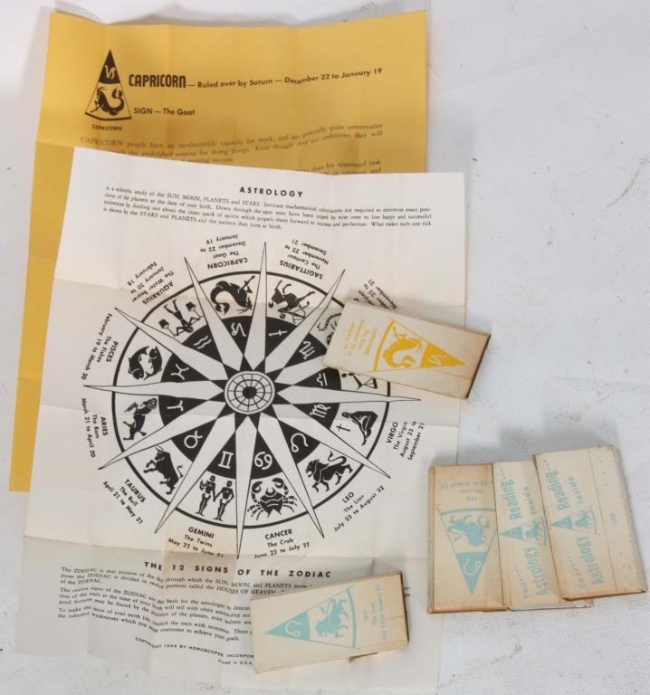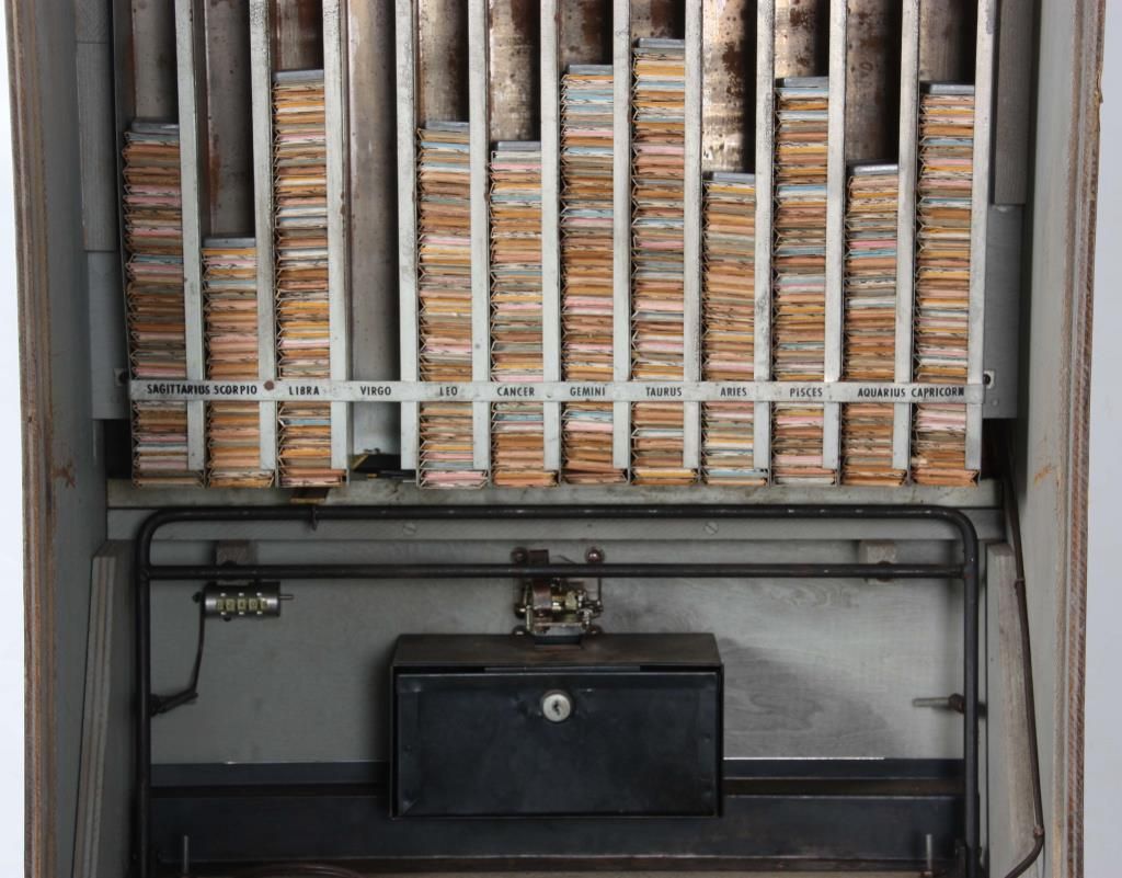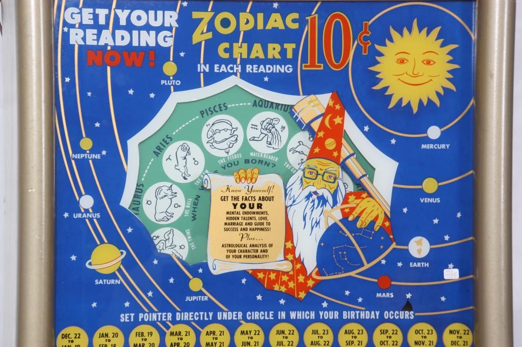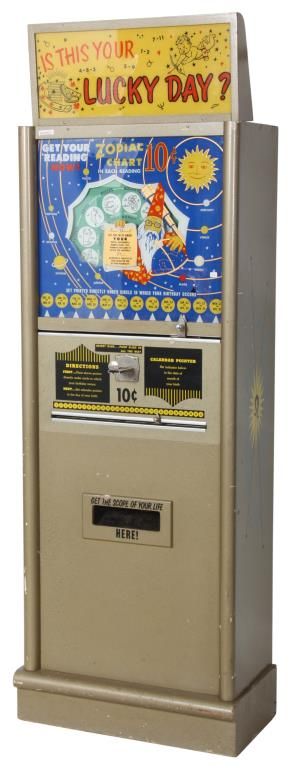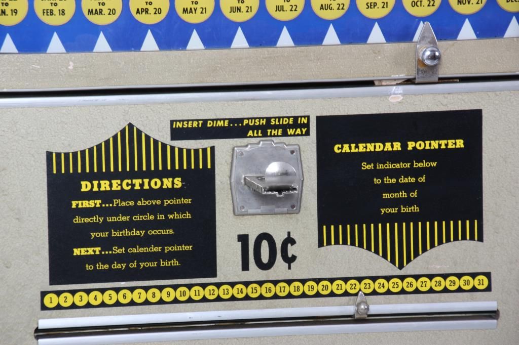 Zodiac 10 Cent Horoscope Vending Machine. The tall wood case is painted green with a reverse decorated glass panel at the top on a blue background, diagram of the solar system and a wizard character. The open center has a rotating disc with the 12 signs of the zodiac and a nickel plated sliding lever below to indicate your selected birth date; below the lever is the 10 cent coin slot and a second sliding lever to select the date of the month. When the slide is pressed and pulled out, a small box containing the selected horoscope is released into the slot at the bottom. The back board of the case reads “Notice: Readings or fillers for this machine can only be purchased from Horoscopes Inc.”; a light up sign on top of the case reads “Is this your lucky day?”. Circa 1956, in good condition with a few minor surface scratches to the case. 75 in. high x 25.5 in. wide x 14 in. deep.