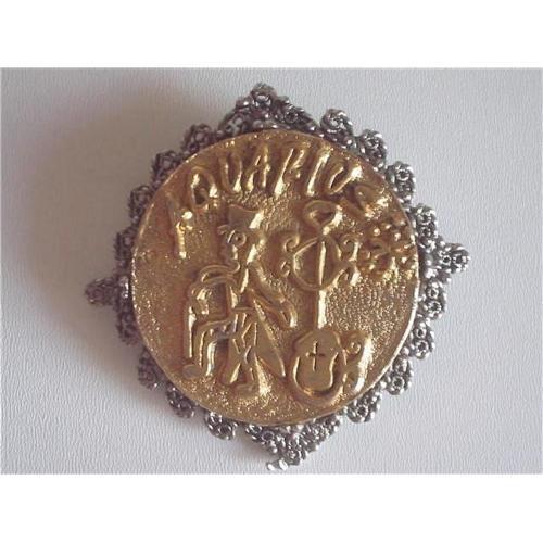 Very ornate "Aquarius" zodiac brooch. The centre gold tone claw set part having a diameter of 1-1/2" showing the word Aquarius at the top and depicting a man in top hat and tails with a walking stick in high relief repousse. There is a very lovely and ornate surround of silver tone giving a lacy filigree look. Safety close on the back. Excellent condition. Co-ordinating Aquarius pendant necklace available at time of listing Item #1584.