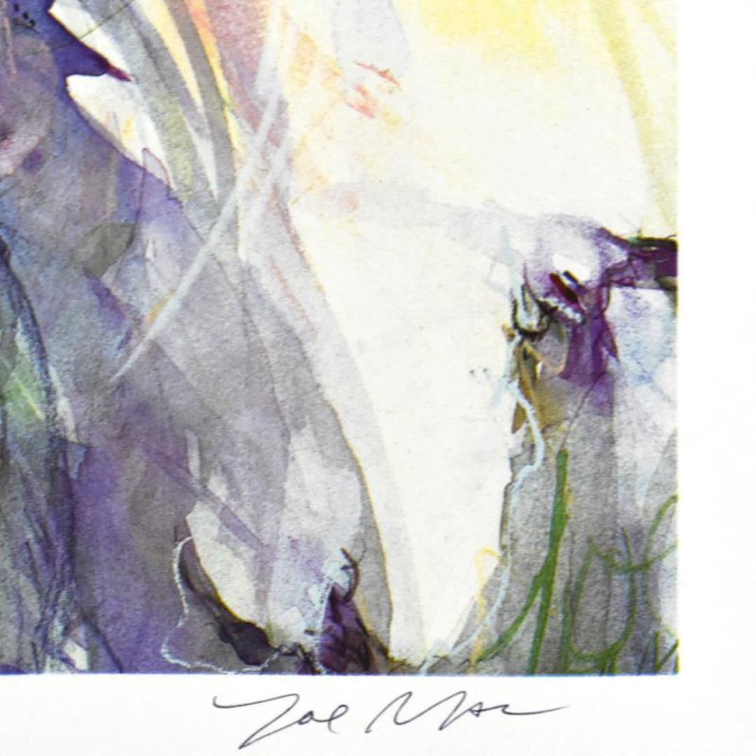 "Bridal Bouquet" is a limited edition lithograph on paper by Zoe Mac, numbered and hand signed by the artist. Includes Letter of Authenticity. Measures approx. 23" x 35" (border), 19" x 24" (image). Please note: there may be minor wear on the corners and edges and/or imperfections in the white border area.