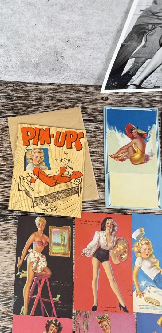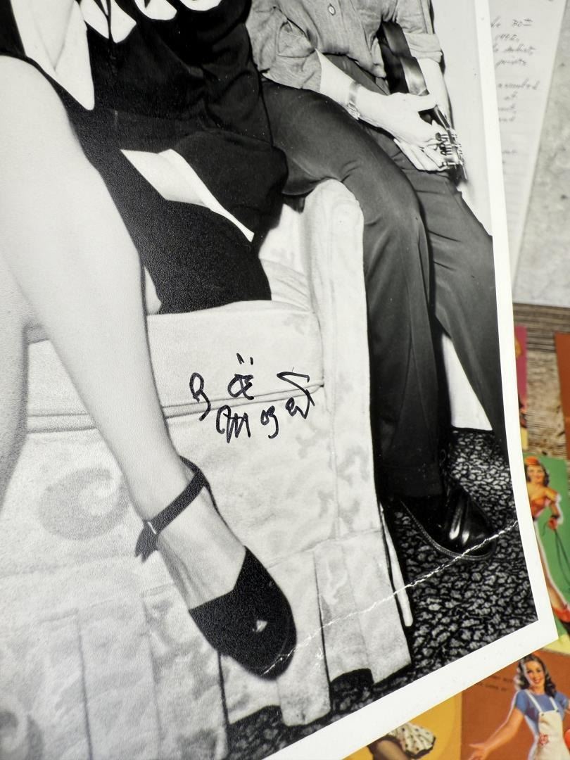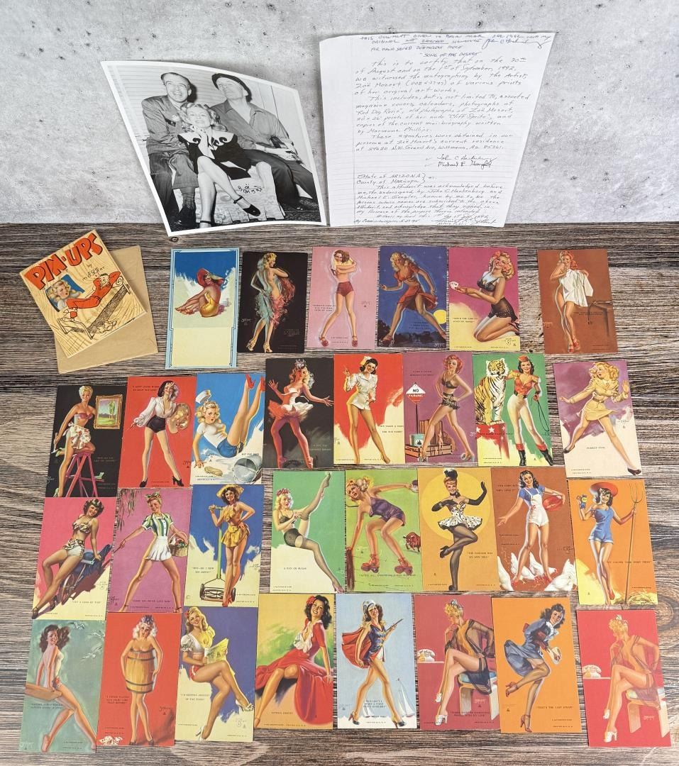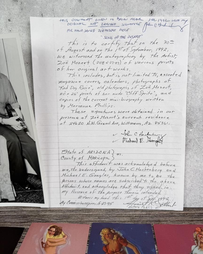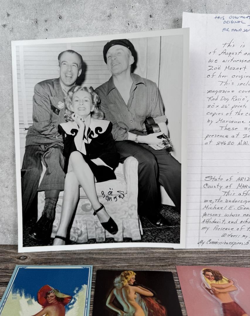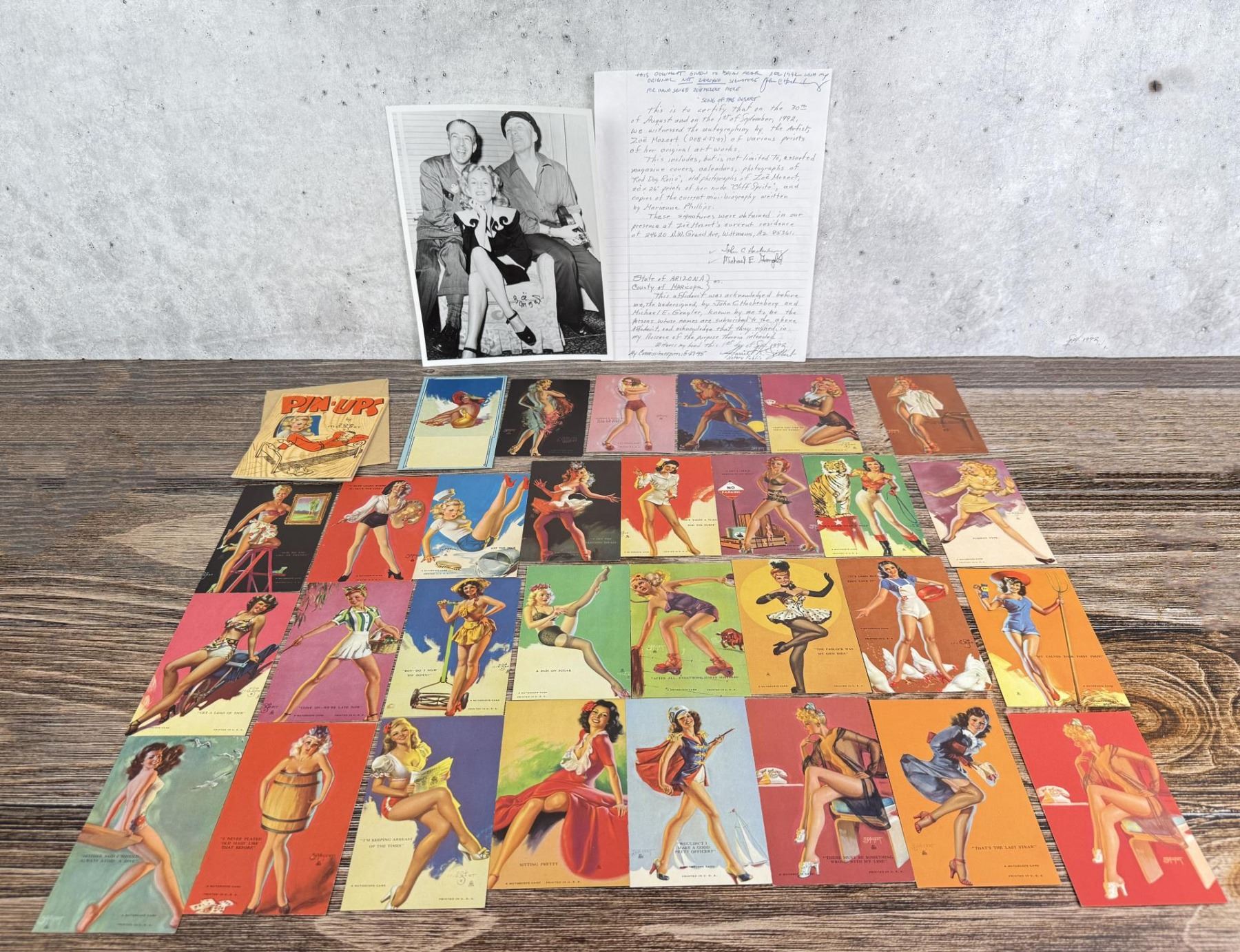 Lot includes autographed photo with affidavit and a large selection of Zoe Mozert pin-up mutoscope cards. Cards measure 5 1/4" by 3 1/4".