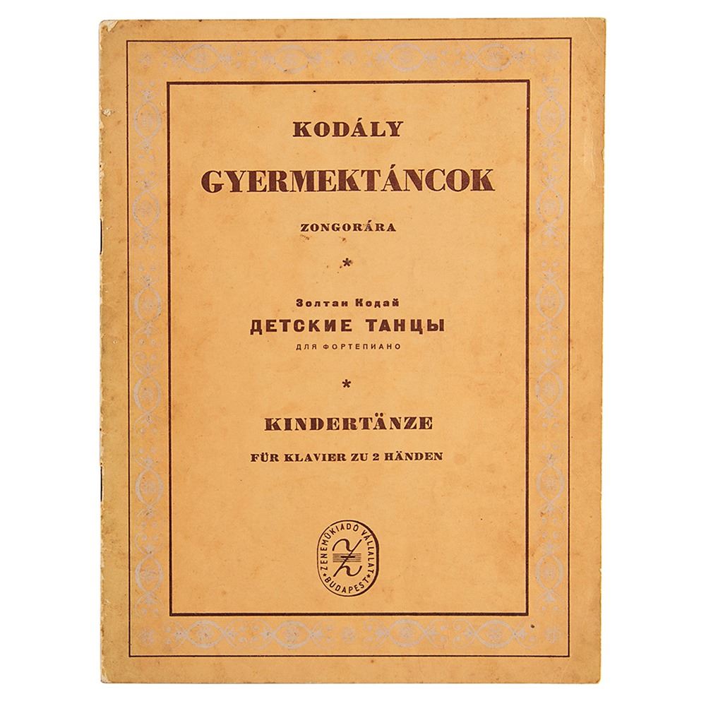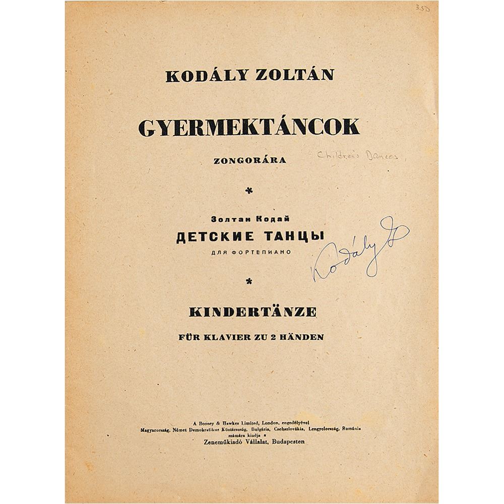 Prominent Hungarian composer, educator, ethnomusicologist, linguist, author, and philosopher (1882-1967). Hungarian sheet music booklet for 'Children's Dances,' 9.25 x 12.25, 26 pages, signed on the title page in blue ballpoint, "Kodaly." In very good to fine condition, with staining and foxing only to the covers; interior pages are all clean.