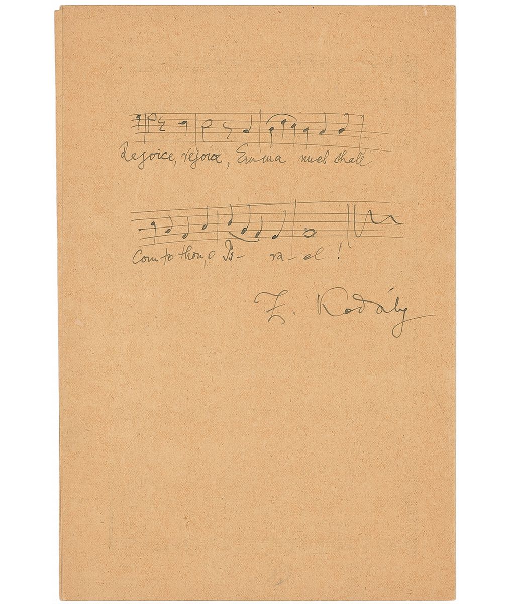 Prominent Hungarian composer, educator, ethnomusicologist, linguist, author, and philosopher (1882–1967). AMQS on the back cover of a sheet music booklet for Kodaly’s ‘Adventi enek,’ 6.5 x 9.75, five pages, signed at the conclusion in black ink, “Z. Kodaly.” The composer pens eight bars of religious music and lyrics, the lyrics reading, “Rejoice, rejoice, Emmanuel shall come to thou, o Israel!” In fine condition, with uniform toning.