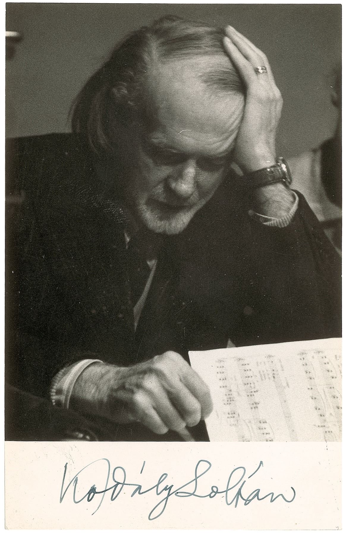 Hungarian composer, educator, ethnomusicologist, linguist, author, and philosopher (1882–1967). Glossy 3.25 x 5.25 photo of Kodaly focused on his sheet music, signed in the lower border in black ink. In fine condition.