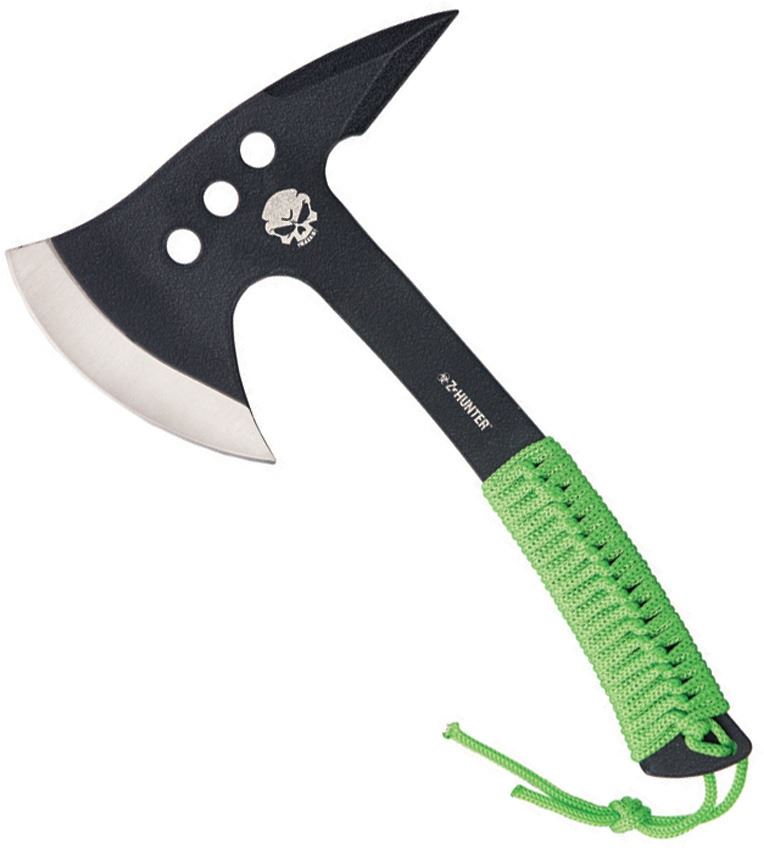 11" overall. One-piece black finish stainless construction with skull and Z-Hunter biohazard logo etch. 7" axe head with 4 1/2" cutting edge and 2 1/2" double edge sharpened pick. Neon green cord wrapped handle. Black nylon belt sheath.