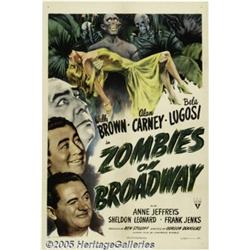 <B>Zombies on Broadway (RKO, 1945)</B></I> One Sheet (27" X 41"). This RKO Radio comedy stars Wally Brown and Alan Carney in what is perhaps there best comedy production. This time the comedic duo are cast as Broadway press agents who strike upon the idea of hiring a genuine zombie to open a new nightclub. To accomplish this feat they consult zombie expert Professor Renault, played by Bela Lugosi. "Zombies on Broadway" scored a hit for RKO who later reteamed Brown, Carney, and Lugosi in the 1946 film "Genius at Work." There is fold line wear, pinholes, border chips, and small tears. The poster has been professionally restored, minimizing these defects. Fine/Very Fine on Linen.