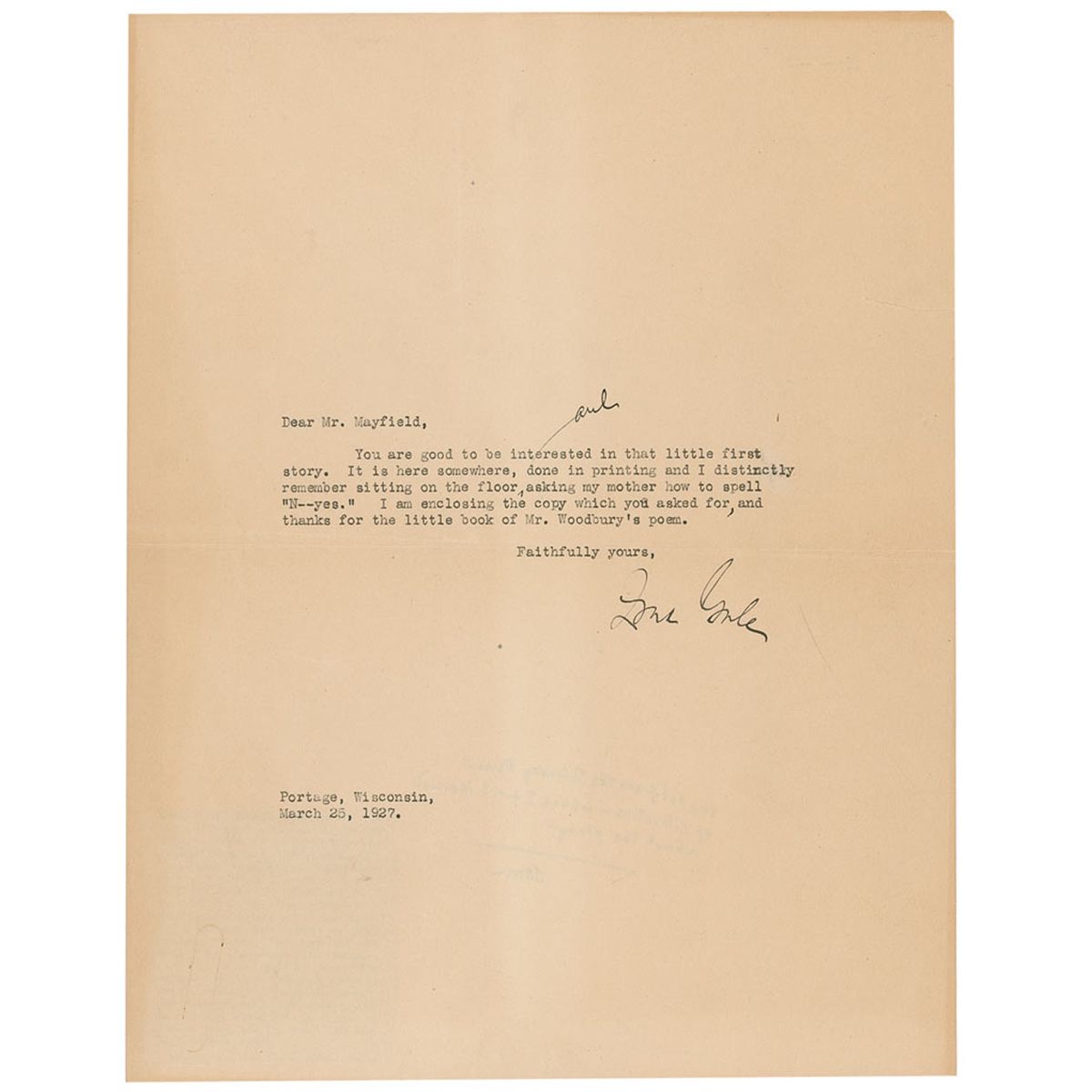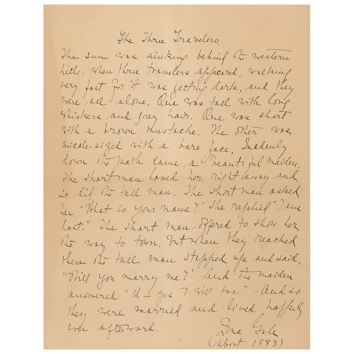 American author and playwright (1874–1938). Gale became the first female to win the Pulitzer Prize for drama in 1921. Two items: TLS, one page, March 25, 1927. In a letter to a fan, Gale writes, in full: “You are good to be interested in that little first story. It is here somewhere, done in printing and I distinctly remember sitting on the floor and asking my mother how to spell ‘N—yes.’ I am enclosing the copy which you asked for, and thanks for the little book of Mr. Woodbury’s poem”; handwritten manuscript of the beginning of her first story, one page, signed “Zona Gale (about 1883),” entitled ‘The Three Travelers.’ Toning to both pages, particularly along the edges, with a strip of light, vertical toning through the center of the TLS, a tear to the right edge, and a clipping affixed to the reverse of the TLS, and paperclip impressions and some small tears along the top edge of each page, otherwise fine condition.
