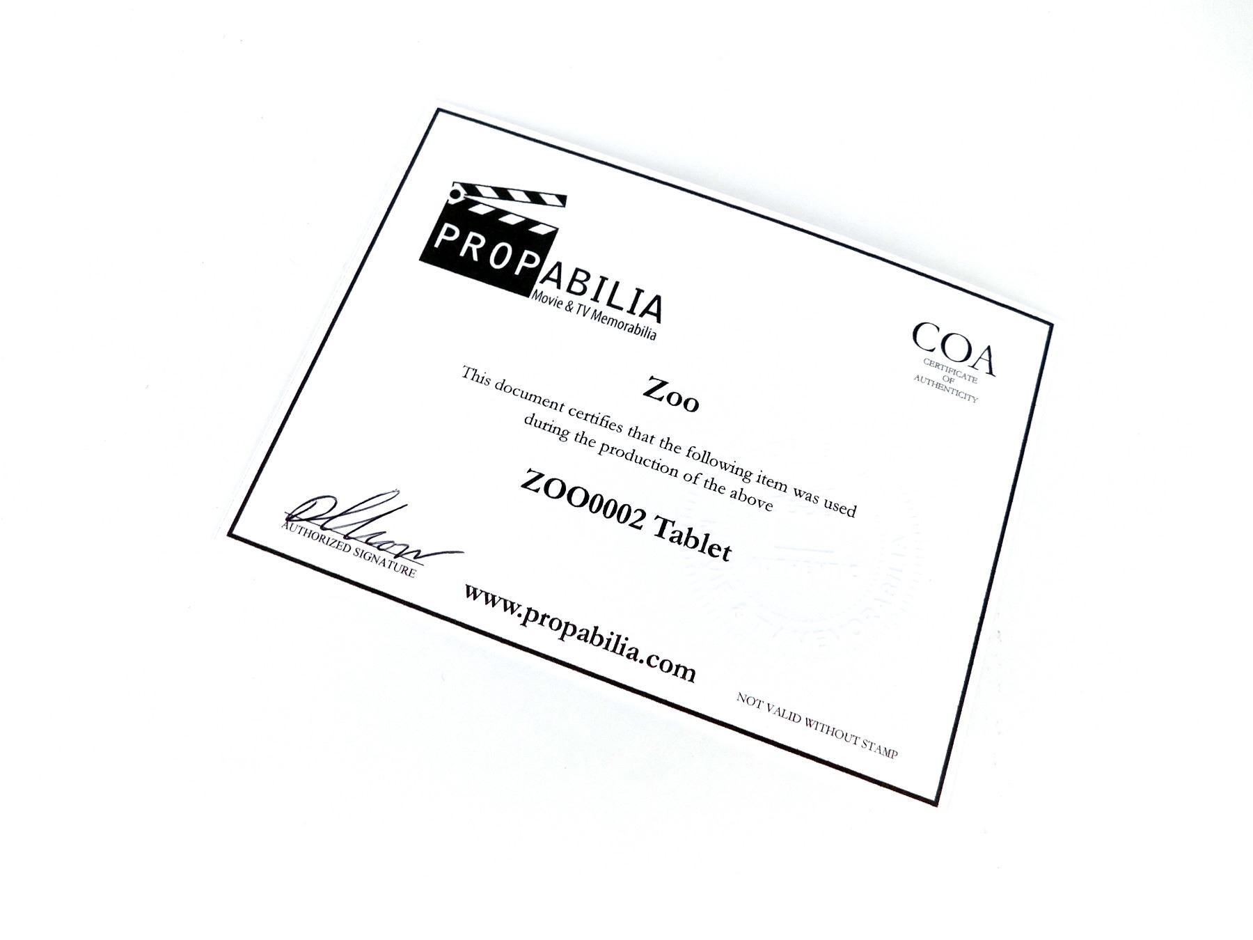 This tablet was acquired by the production for use in 'Zoo' (James Patterson Entertainment, 2015-2017).