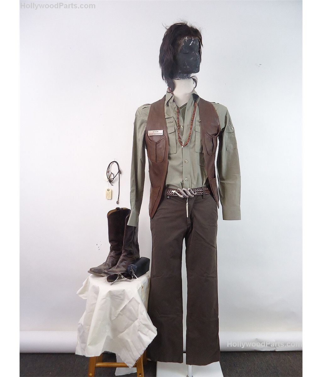 Hero outfit worn by Ken Jeong as Venom in Zookeeper. Costume consists of custom made brown leather vest, name tag reads, "Venom Senior Zookeeper"; Greenish khaki long sleeve shirt, Inscribed "Venom #1"; John Varvatos green semi-open t-shirt with snap buttons; brown leather woven belt with silver metal coiled snake buckle; Lucchese pair of women's brown leather cowboy boots; Oliver People's metal frame smoked sunglasses; and other accessories. Screen used in Python Enclosure.