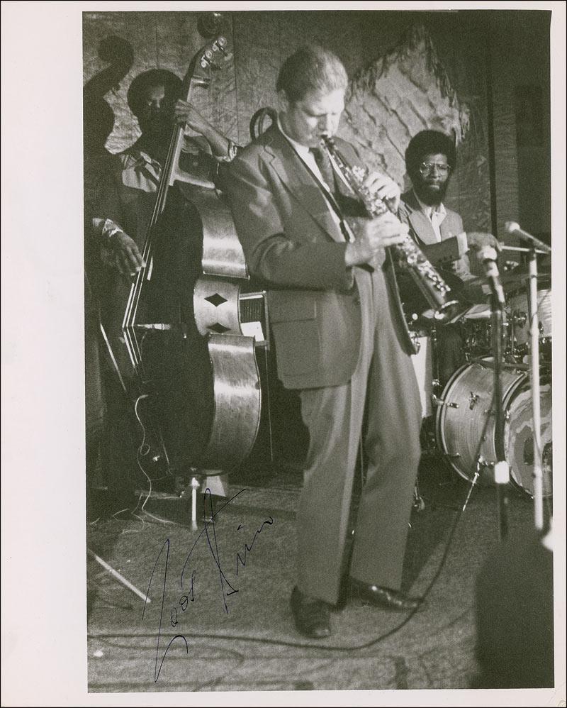 Semi-glossy 8 x 10 cardstock photo of Sims performing, signed in blue ink. In fine condition, with light rippling to photo, a few surface impressions, and a couple minor corner creases.