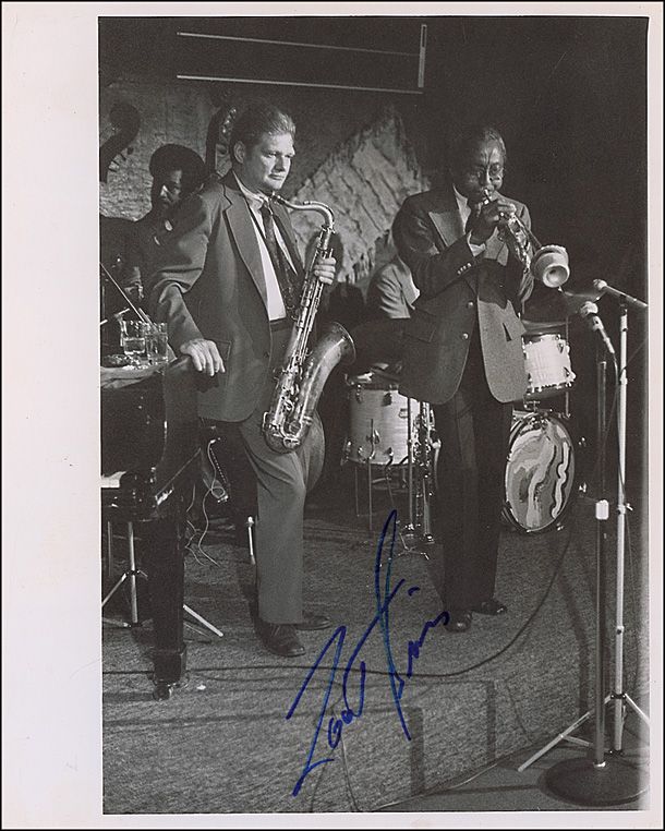 American jazz saxophonist (1925-1985). Classic semi-glossy 8 x 10 cardstock photo of Sims performing on stage, signed in blue felt tip, “Zoot Sims.” In fine condition, with light corner creasing and rippling along the bottom border.
