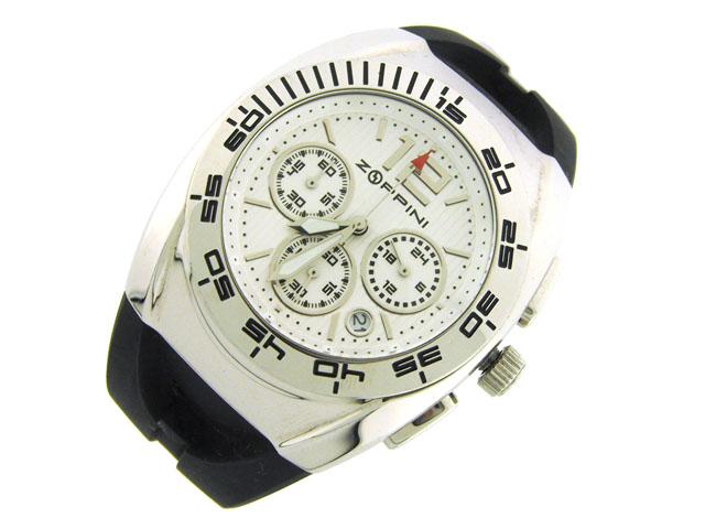 The watch has the following features: Chronograph functions; Stainless steel; Rubber strap with buckle that has a ZOPPINI logo; Round shape bezel; Number notched white dial; Luminous hands; and Water resistant.