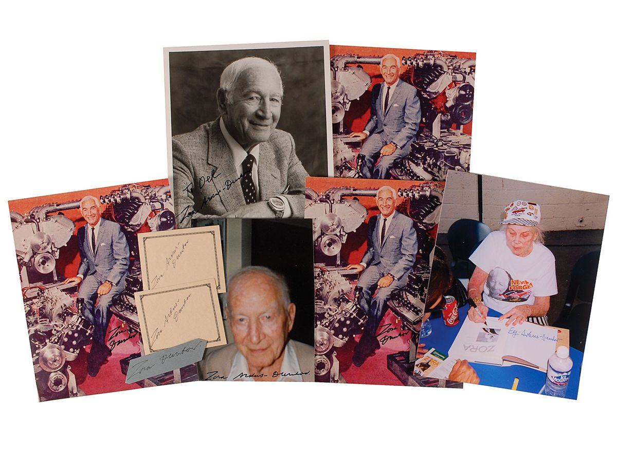 Known as Mr. Corvette, he is the member of many Halls of Fame. Nine items: three identical color glossy 8 x 10 photos of Duntov posing with his engines, each signed in black felt tip; glossy 8 x 10 photo signed and inscribed in black felt tip; color glossy 6 x 8 photo, signed in full in black felt tip; two beige 4 x 3 bookplates, both signed in black ink, “Zora Arkus Duntov”; a clipped ink signature; and a color satin-finish 8 x 10 photo of his wife Elfi signing a book, signed in blue ink by her. In fine condition.