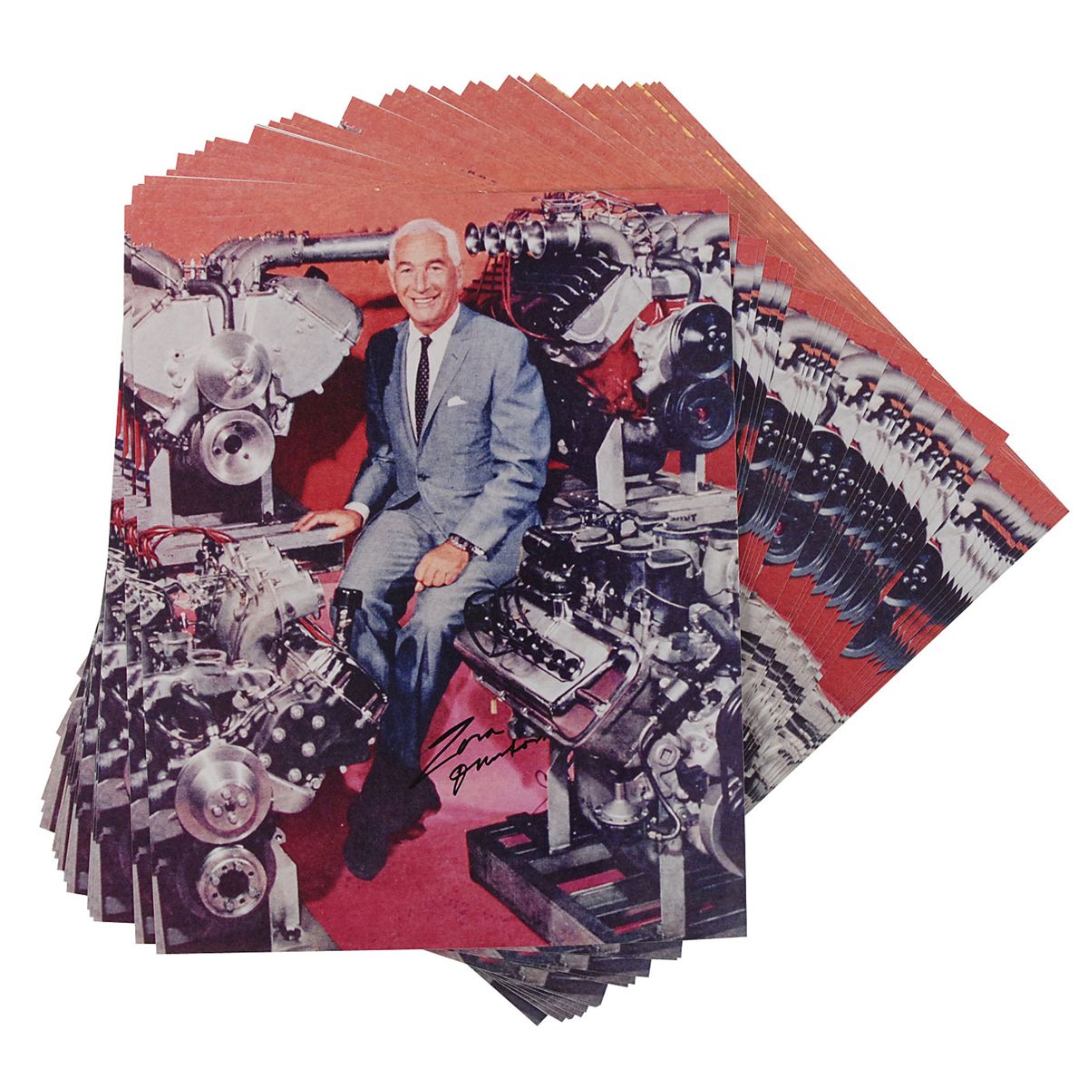 Automotive engineer known as the ‘Father of the Corvette’ (1909–1996). Thirty-five identical color glossy 8 x 10 photos of Duntov surrounded by engines, each signed in black felt tip. In overall fine to very fine condition.
