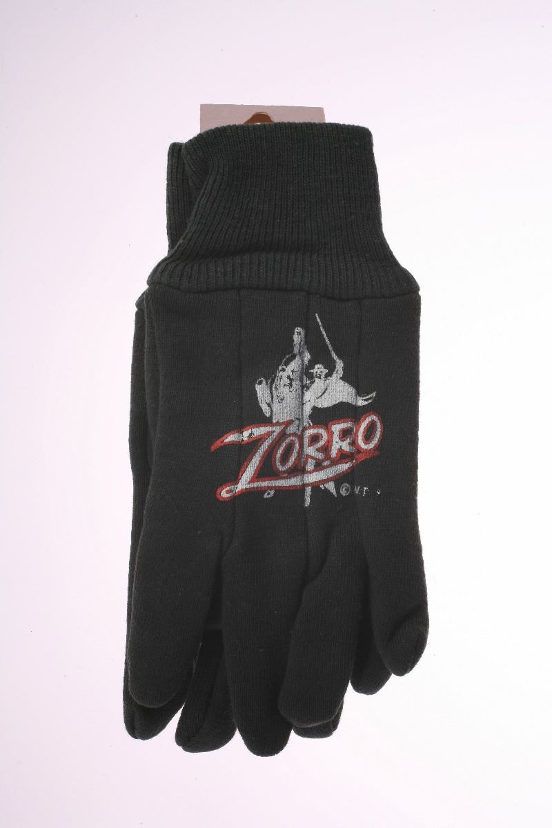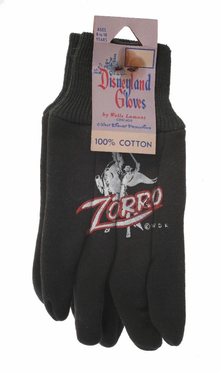 (Disneyland, 1960s) Pair of Disneyland gloves by Wells Lamont featuring Zorro-themed artwork. Unused, and still retains the original Disneyland price tag. Measures 7.25"x3.25". In good condition with some staining to the tag from the staple used to keep the gloves together.