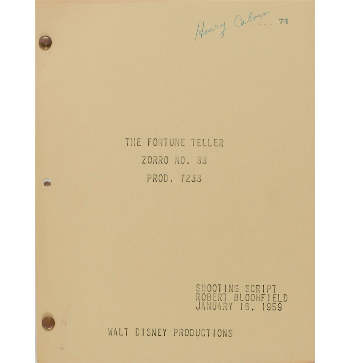 American comic actor (1918–1975) best known for his role as Sergeant Garcia on the 1950s TV series Zorro. Brad-bound shooting script for Walt Disney’s Zorro episode entitled The Fortune Teller, 8.5 x 11, 40 pages, labeled at the bottom of the cover, “Shooting Script…January 16, 1959.” Signed on the front cover in blue ink by Calvin. Script also bears multiple notations, most in red pencil, where Calvin’s character name has been circled, and several other passages having been underlined, as well as a couple changes to his dialog. In fine condition. Excellent association between Calvin and his best known role.