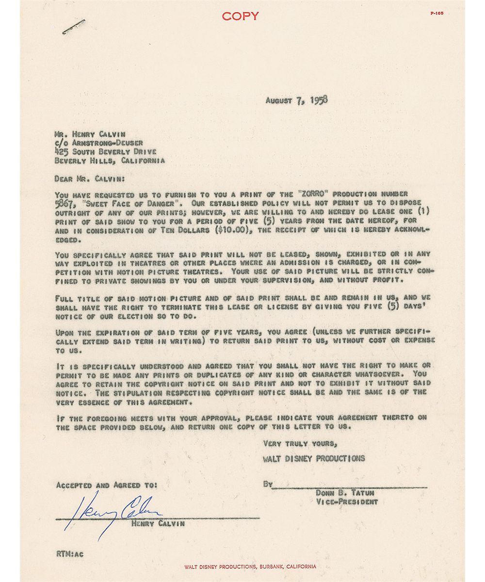 DS one onionskin page, 8.5 x 11, August 7, 1958. Agreement between Calvin and Walt Disney Productions for Calvin to lease a print of the Zorro episode entitled “Sweet Face of Danger” for a period of five years for a payment of $10. Signed at the conclusion by Calvin. In fine condition, with usual document wear.