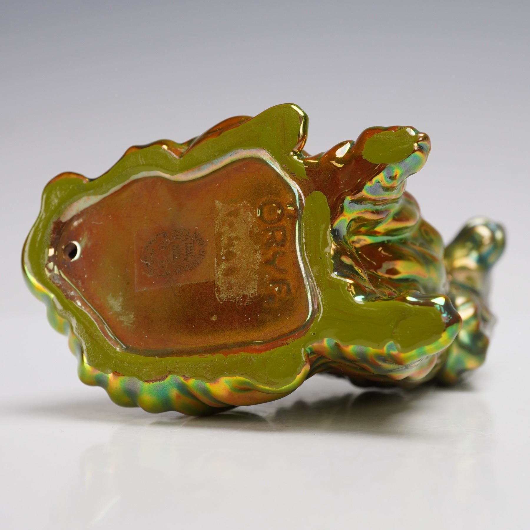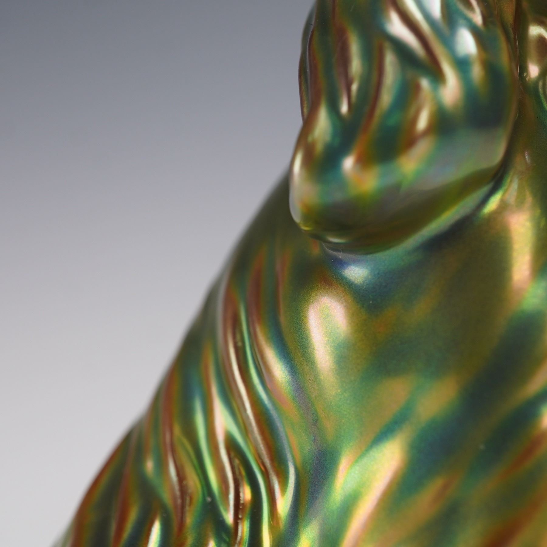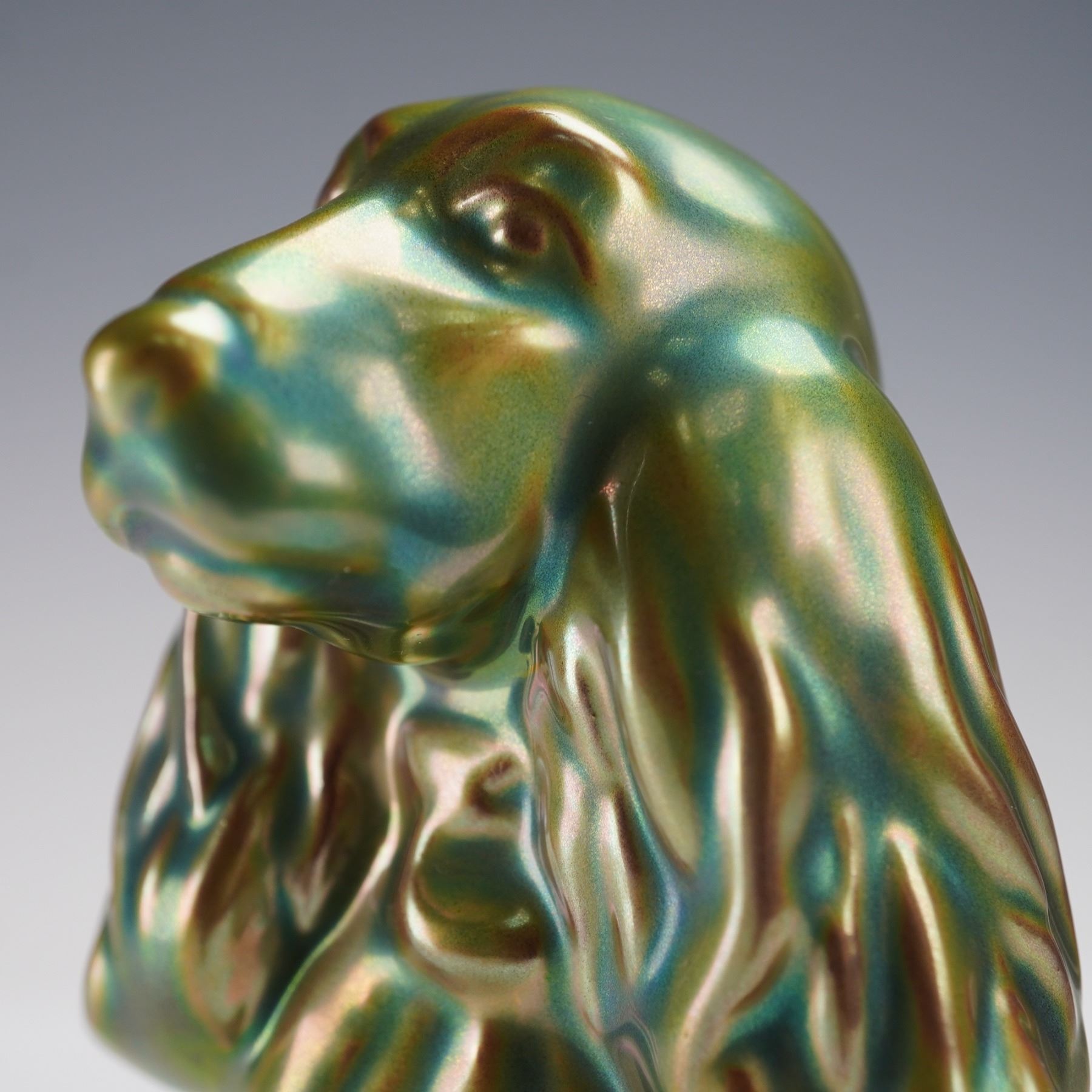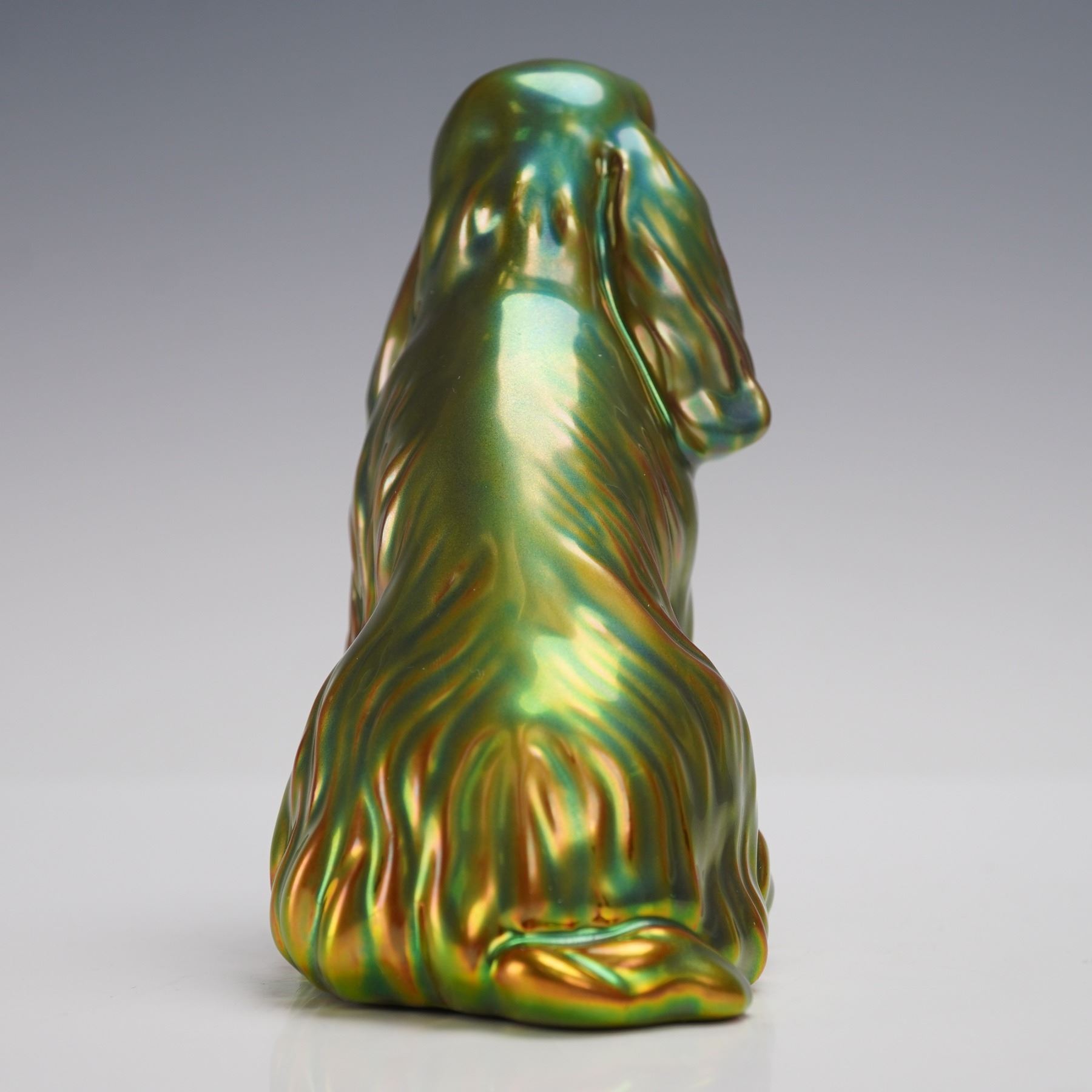 One of a kind porcelain figure depicting a seated cocker spaniel. This figure was finished in the Eosin technique. Exhibits a radiant interplay of iridescent green, gold, and bronze hues. Zsolnay Hungary backstamp.
