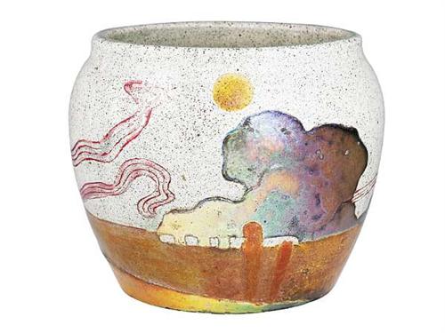 Stoneware. Pressed into mould, with relief-pattern. The recessed parts are with transparent and the protuberant parts with opaque eosin glazes. Design: Apáti Abt Sándor, 1903. Scratched number on the bottom: (7191) round seal like mark. Zsoln
