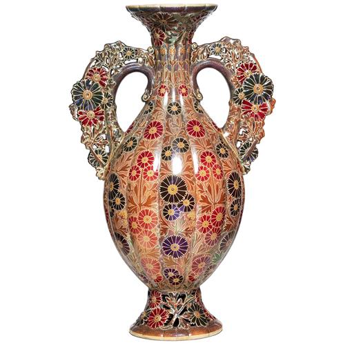 Zsolnay vase, elaborate ribbed form with pierced handles and foot with a colorful metallic floral design, signed,11.75in.h, repair to foot