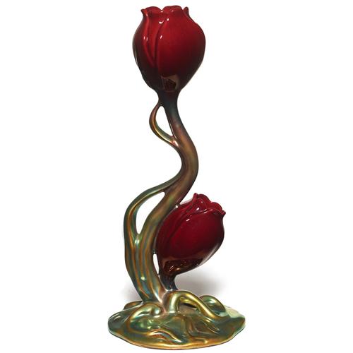 Zsolnay vase, unusual sculpted tulip form with blossoms of deep red and iridescent green and gold stems and leaves, marked, #5723, 10"h