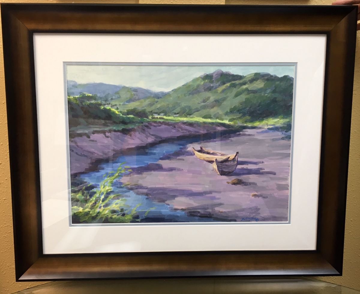 Ho's original, a 15.5x21.5" gouache on paper, takes us to a peaceful deserted cove on a beach south of his native Shanghai, where fishermen have stashed their boats until their next venture out into the bay. "Fishing Boats" is beautifully framed in a copper toned molding with two acid-free mattboards and plexi. It measures 26x32" framed.