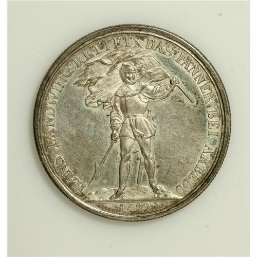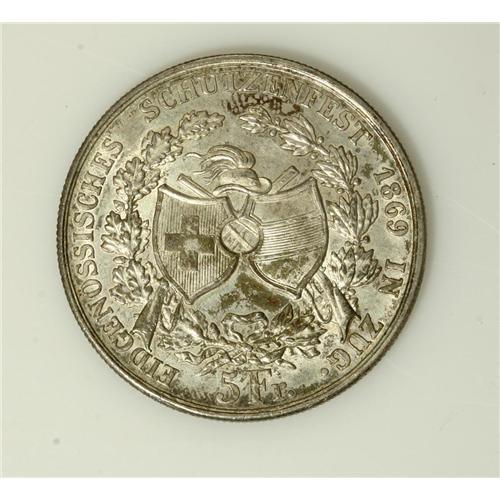 <B>Zug. 5 Francs 1869,</B></I> KM-S10, issued for the shooting festival, UNC with attractive, well-set, medium silvery gold toning. The mintage was just 6,000 coins.<BR><I>From the Shinholser Collection</B></I><BR><BR><b>Shipping:</b> Coin/Currency (<a target="_blank" href="http://www.heritageauctions.com/common/shipping.php">view shipping information</a>)