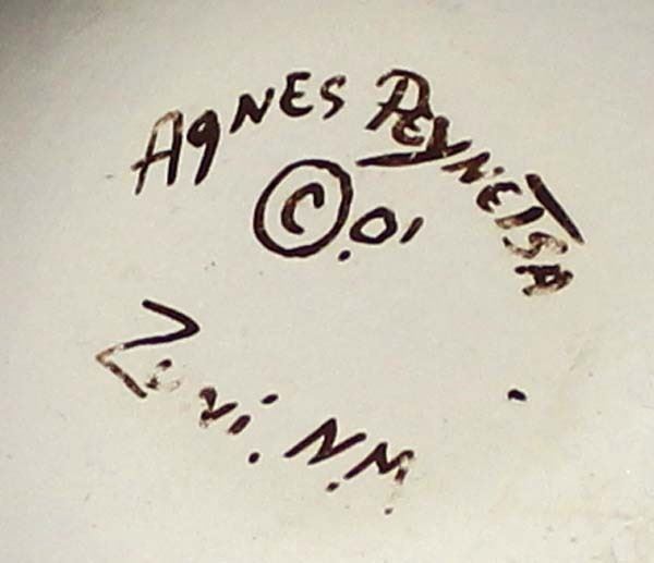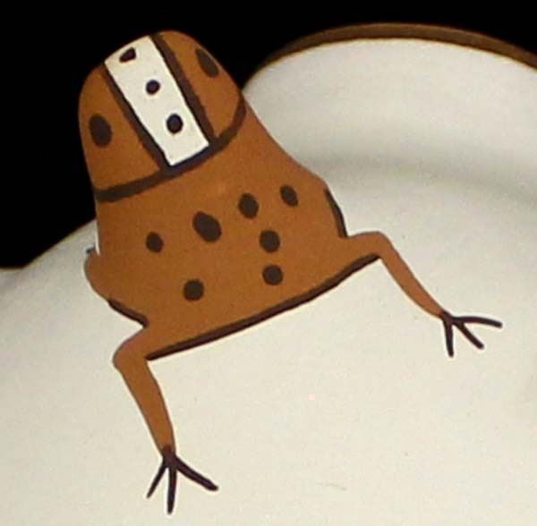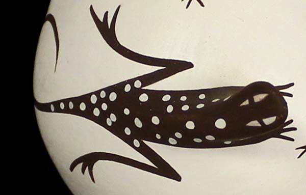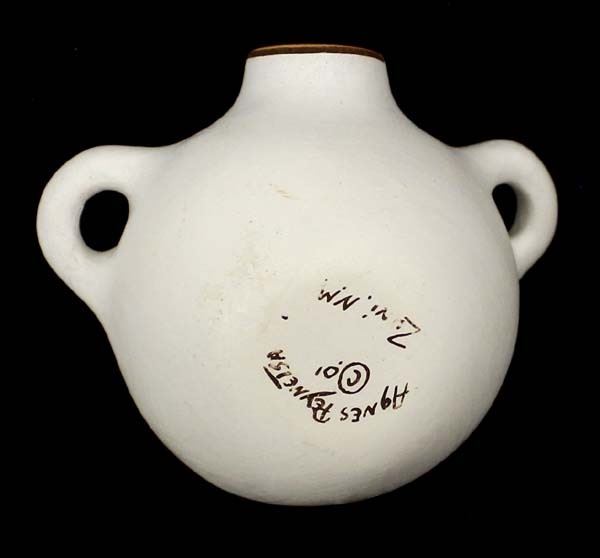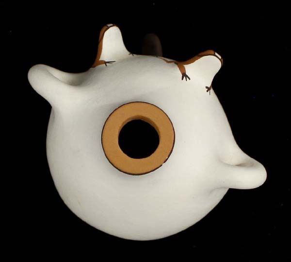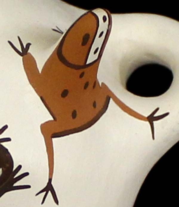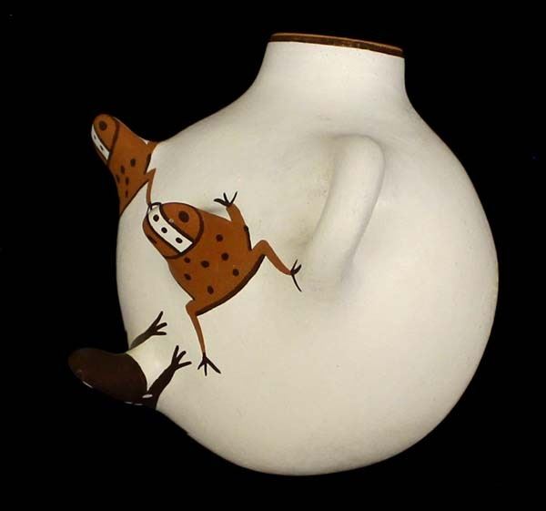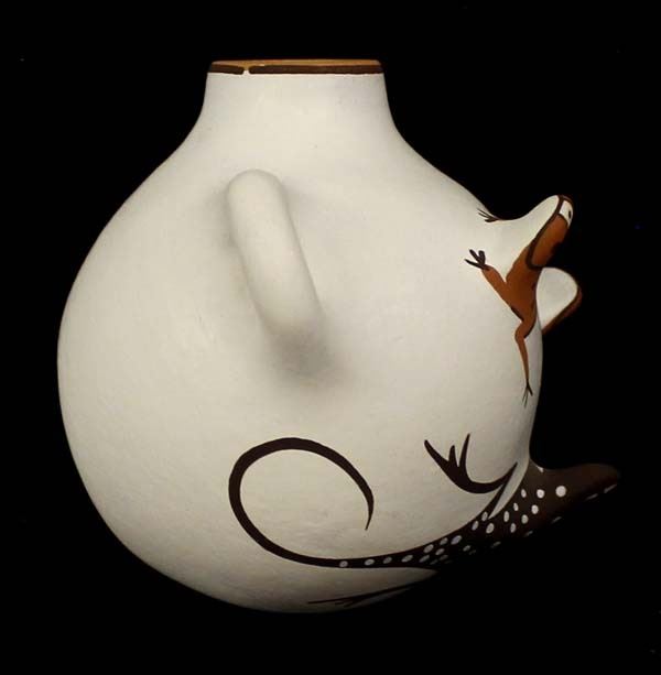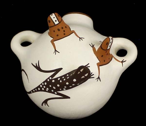 2001 Native American Zuni 3 Dimensional Frog & Lizard Pottery Canteen by Agnes Peynetsa (b. 1962), measures 3'' x 3.5'' x 3'' and is signed on the bottom, FYI: ''Active ca. 1984-present, polychrome on whiteware jars, cornmeal bowls, effigy frog and lizard pots, frog figures, seed pots, canteens, miniatures, and jewelry''