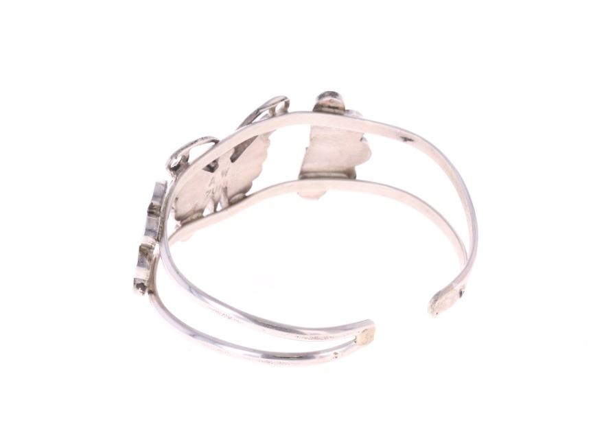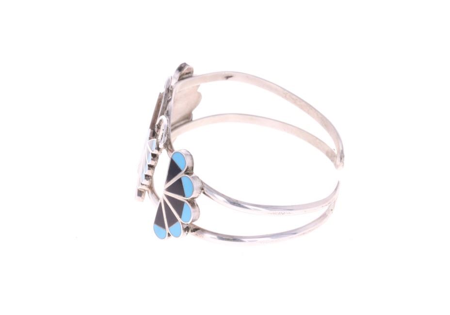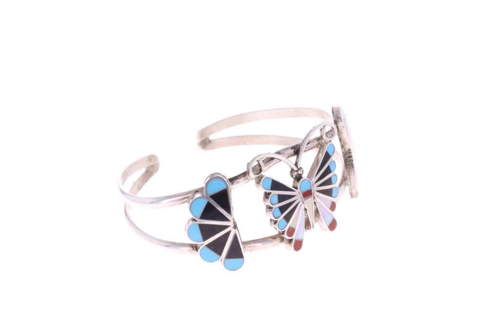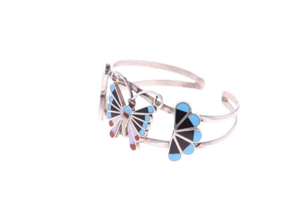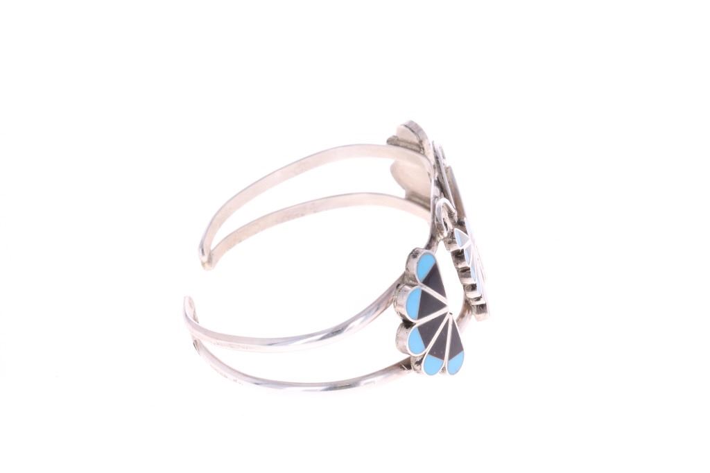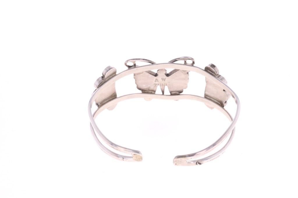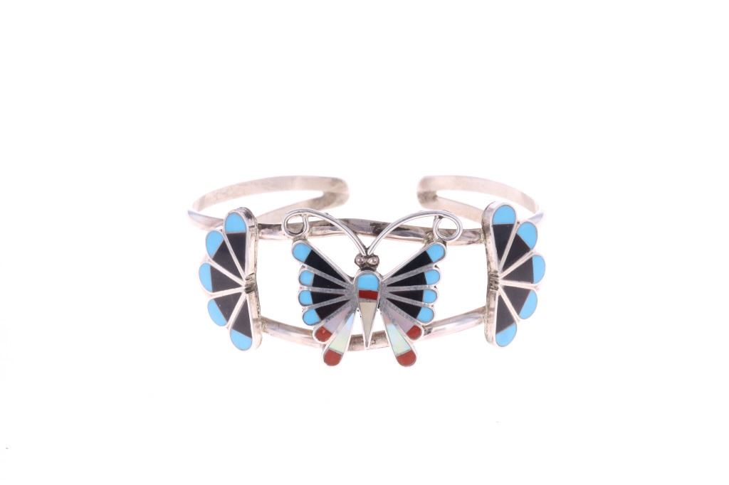 Presented in this lot is a Zuni Adrain Wallace Multi-Stone Butterfly Inlay Cuff Bracelet. This inlay cuff bracelet features a wonderfully and professionally crafted sterling silver split shank construction and incorporates channel inlay of Sleeping Beauty turquoise, Jet, red branch coral, red spiny oyster and Mother of Pearl, with silver beads and silver wire. Wallace has made quite a name for her precisely made picturesque Zuni inlay work, and is known for her butterflies, thunderbirds, Kachinas and the Sunface inlays. Adrian Wallace (sometimes identified as Adrian Elizabeth Wallace) is a prominent Zuni Puebloan jewelry artist celebrated for her intricate and picturesque mosaic inlay work. Based in the Zuni Pueblo in New Mexico, she is widely recognized for her mastery of traditional lapidary skills, where stones are hand-cut and polished to fit precisely within sterling silver settings. The artist's hallmark is stamped on the reverse, "AW ZUNI". The bracelet is in beautiful condition. Measures 6.5" inside circumference including the .5" opening, 1"W x 2.25"L x 1.75"D, collective weight is 19.6 grams.