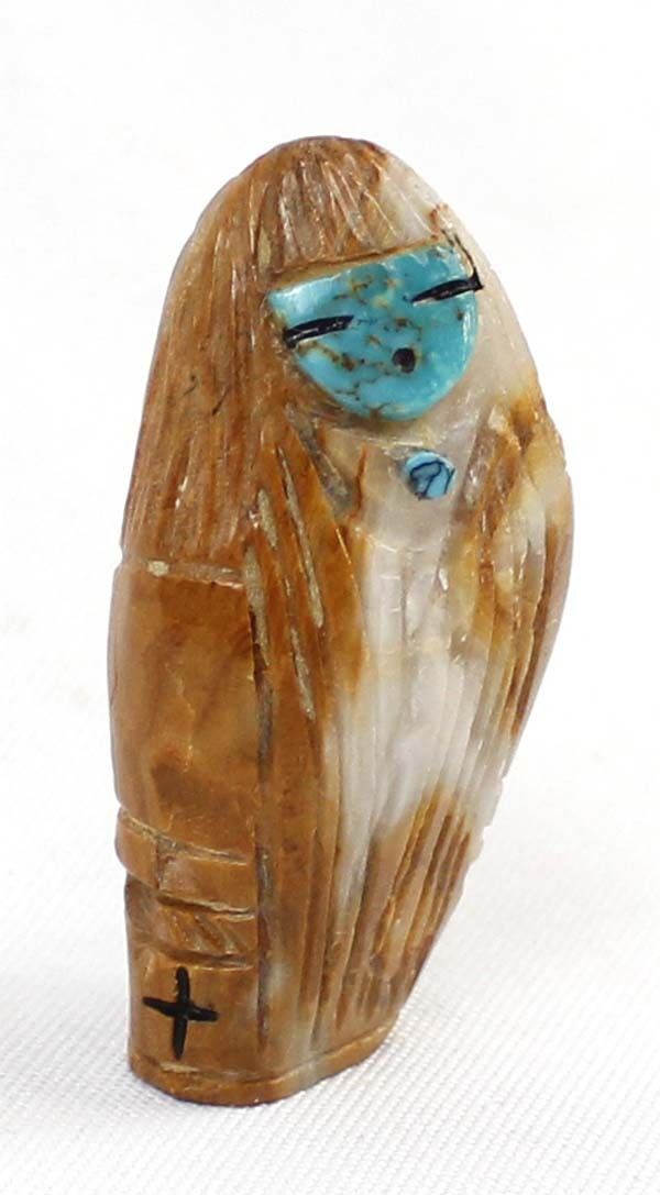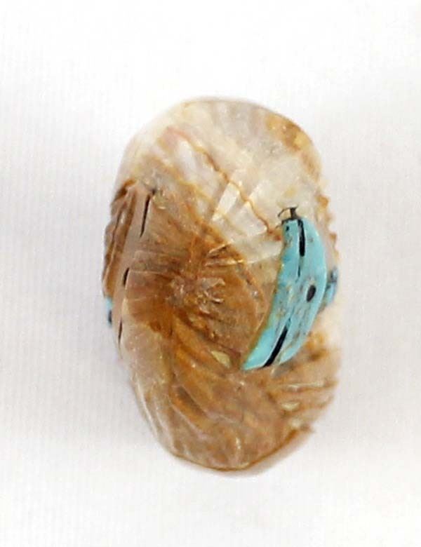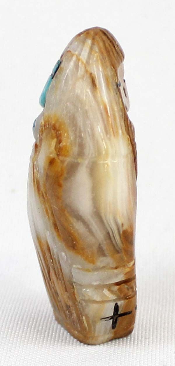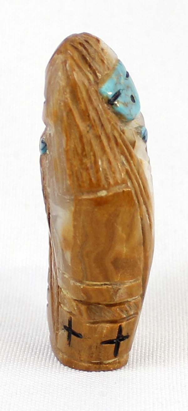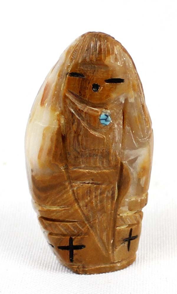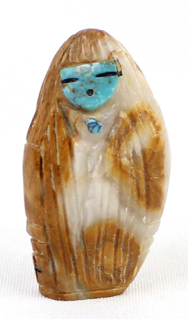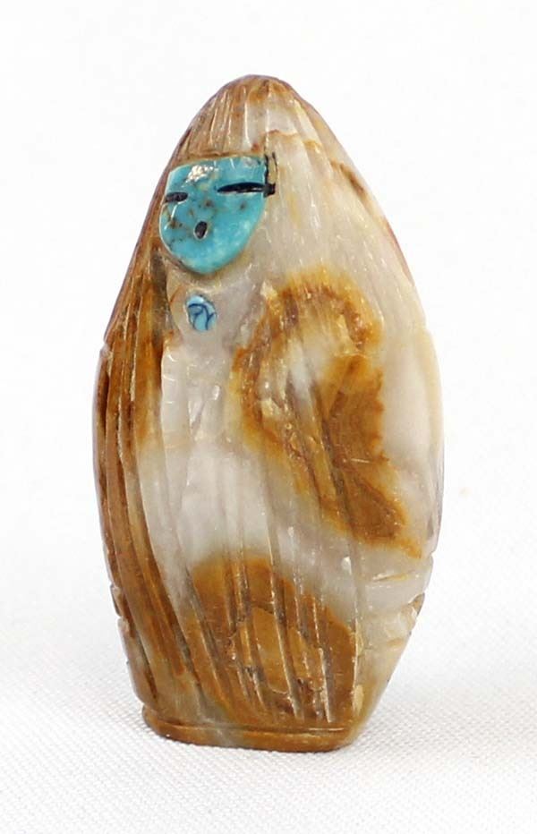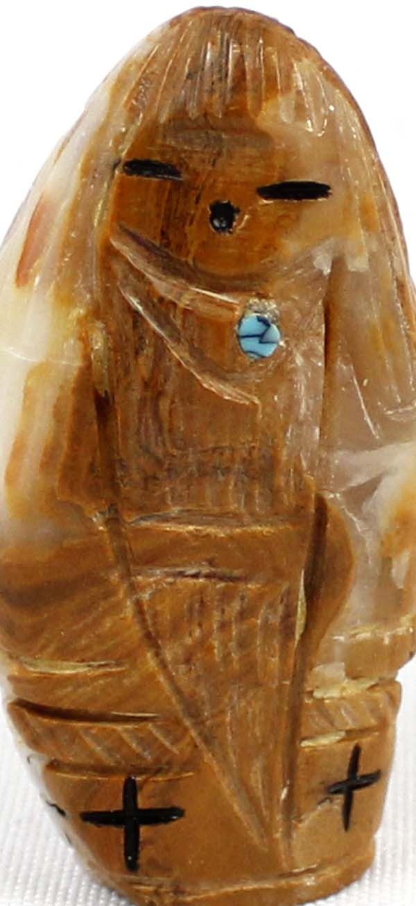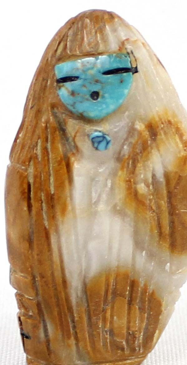 Native American Zuni Agate Double Corn Maiden Fetish Faye Quandelacy, measures 2.25'' x 1.25'' and has artist's initials on the bottom, embellished with turquoise, features turquoise face on one side and natural stone face on the other