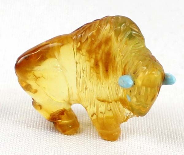 Native American Zuni Amber Buffalo Fetish by Andres Quandelacy, turquoise eyes, heartline, and horns, measures 1.25'' x 1'' x .5''