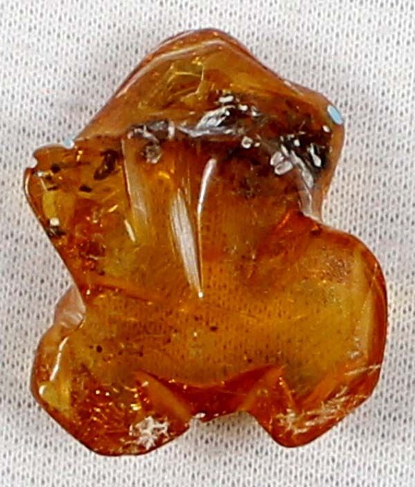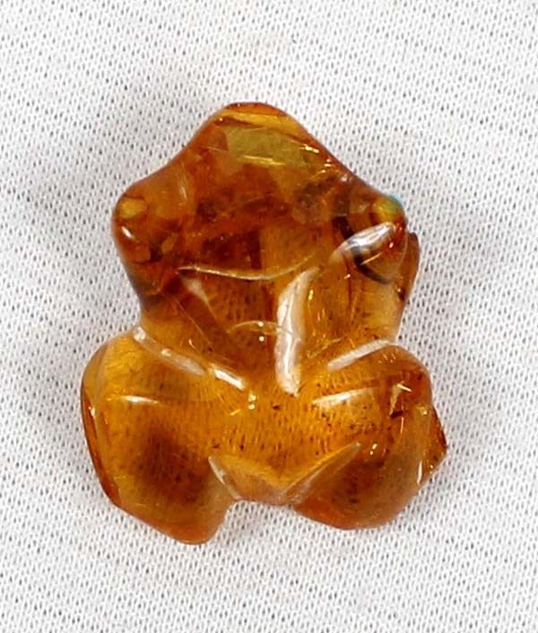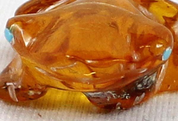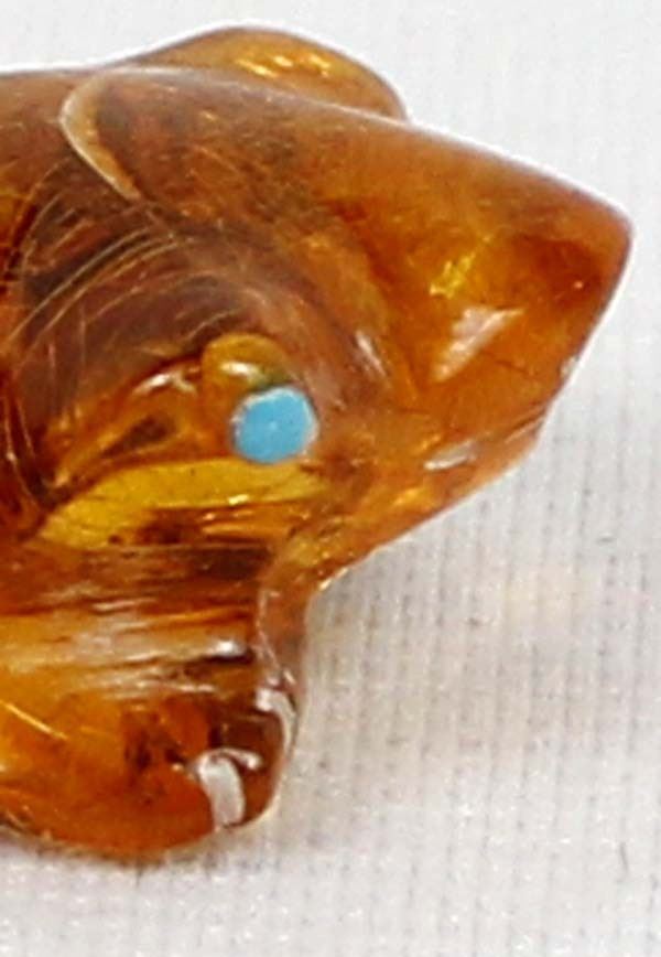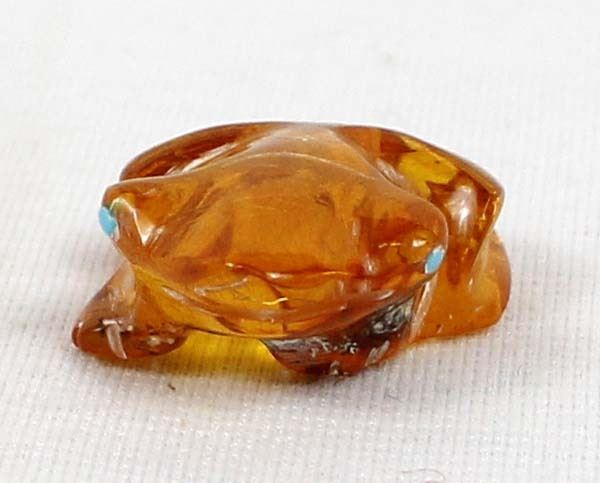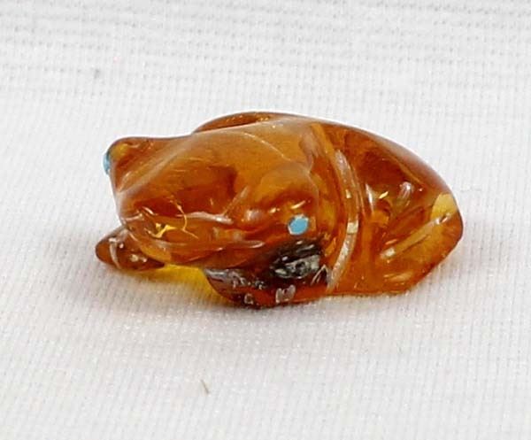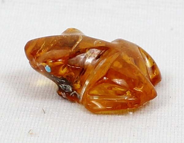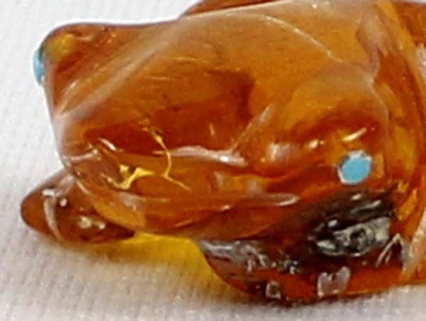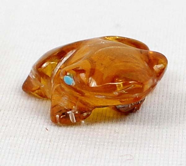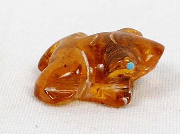 Native American Zuni Amber Frog Fetish by Boone Family, measures 1'' x .75'' and is signed on the bottom, turquoise eyes