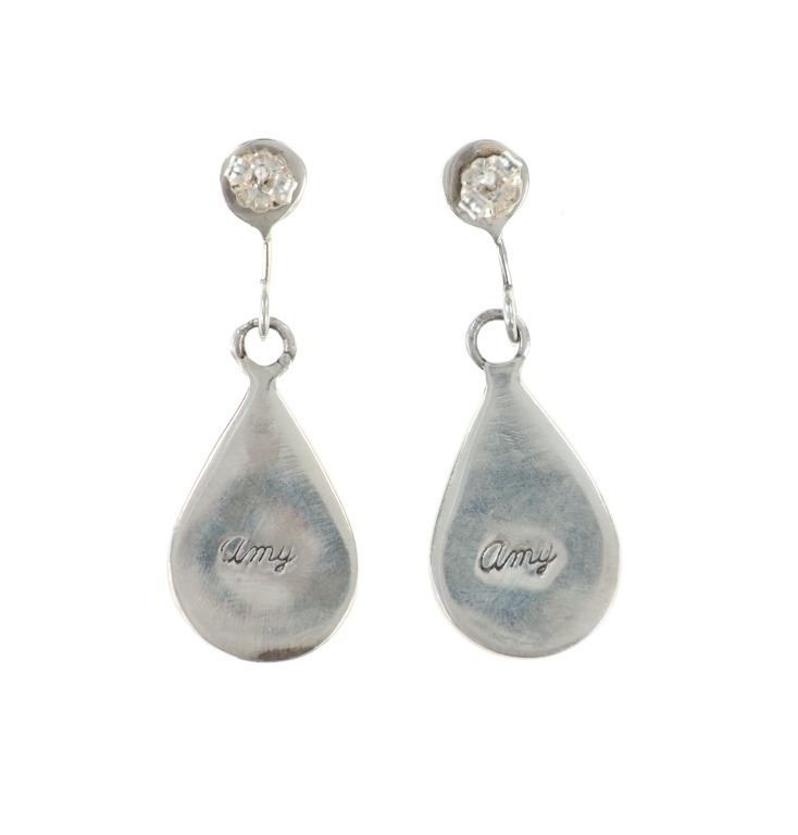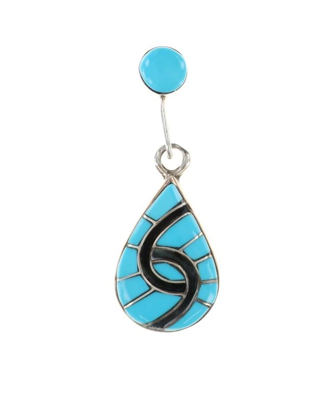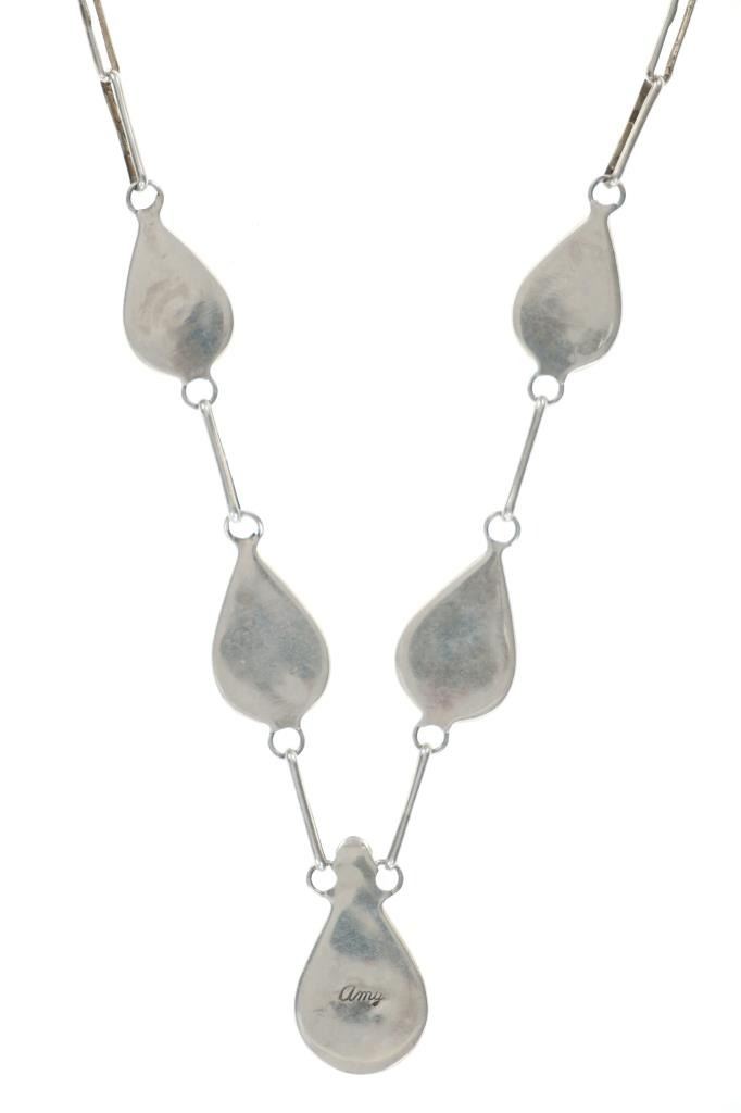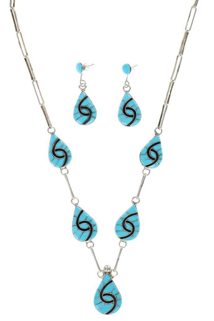 Featured in this lot is this sterling silver turquoise hummingbird jewelry from Zuni artist Amy Weslay. There is a pair of earrings and a necklace in this collection. The necklace shows a sterling silver link chain with linked pendants of inlaid hummingbird decoration with turquoise cabochon set into the pendants. The earrings feature stud dangle design with inlaid turquoise cabochon set into the earrings with a hummingbird decoration with round turquoise cabochon set to the studs. The jewelry is marked as follows: Amy. The condition of this Zuni jewelry set is good with no obvious signs of damage and shows good overall condition. The measurements of this necklace from clasp to clasp is 24" and the central pendant measures 1 1/2" x 7/8" and the earrings measure 1 3/4" x 3/4". The collective weight of this jewelry set is 54.8g.