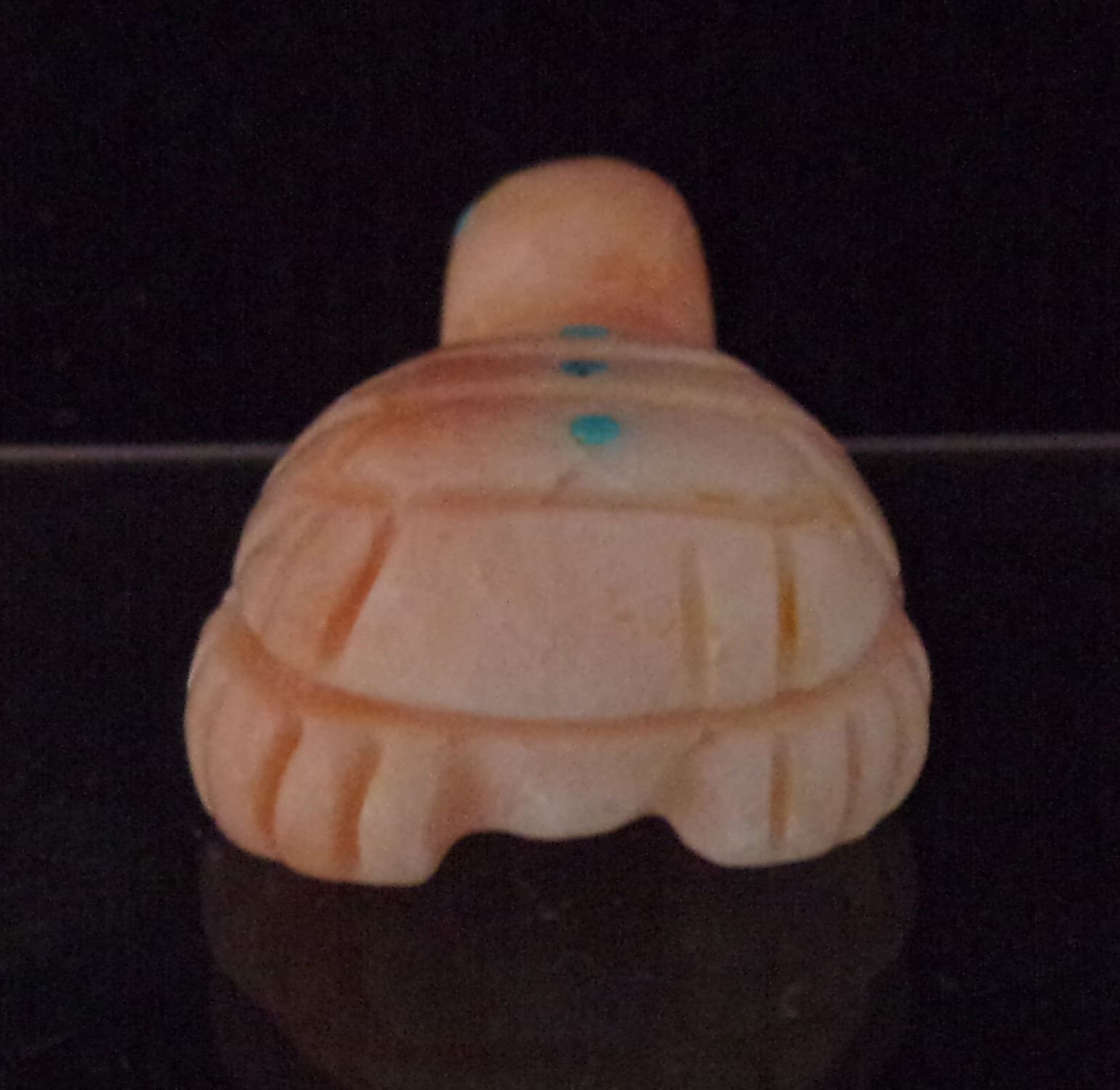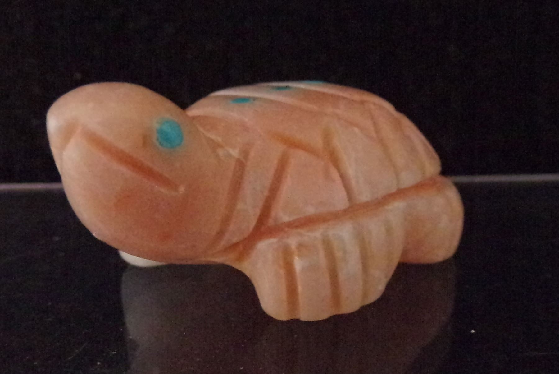 Native American Zuni Angel Coral Turtle Fetish by Georgette Quam, measures 1'' x 1.5'' x .75'' and is signed on the bottom, turquoise eyes and spots on shell