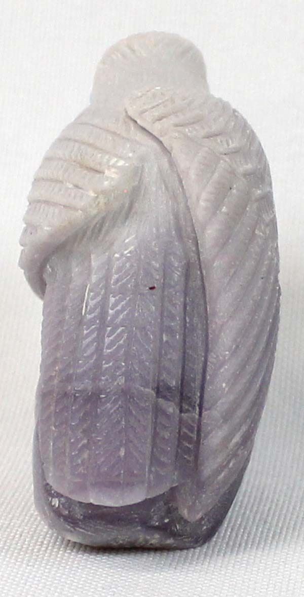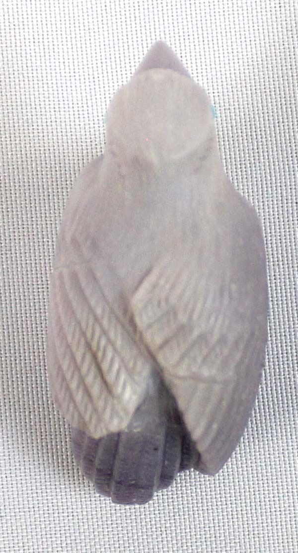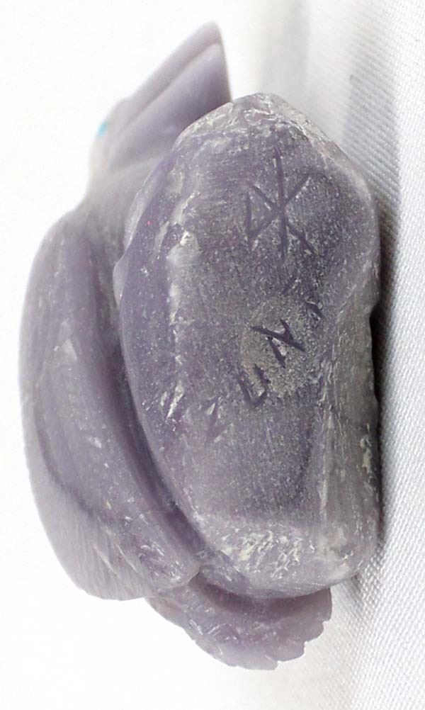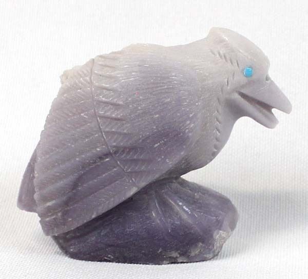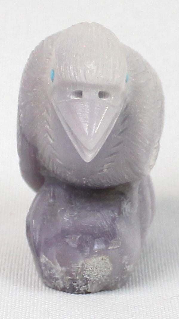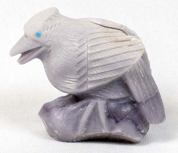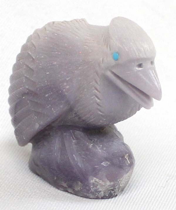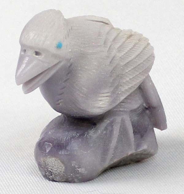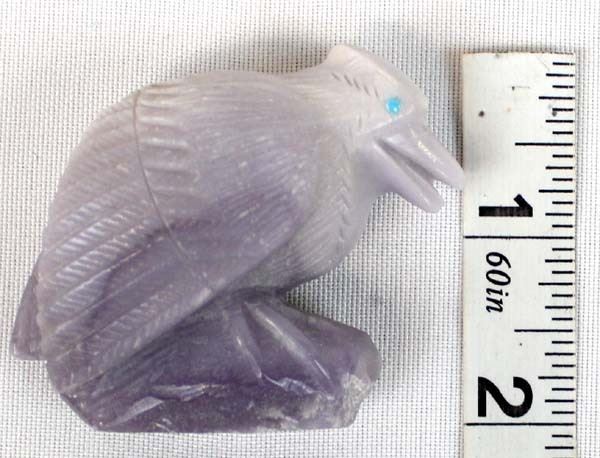 Native American Zuni Angelite Bluejay Fetish by Derrick Kaamasee, measures 2'' x 2.25'' x .5'' and has artist's initials on the bottom