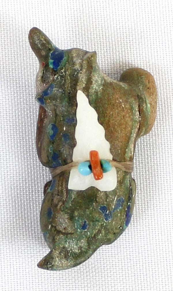 Native American Zuni Azurite & Malachite Badger Fetish by Jeffery Tsalabutie, measures 2'' x 1.25'' x 7/8''H, mother of pearl arrowhead spirit bundle embellished with turquoise and coral nuggets, signed on the bottom Jeff T.
