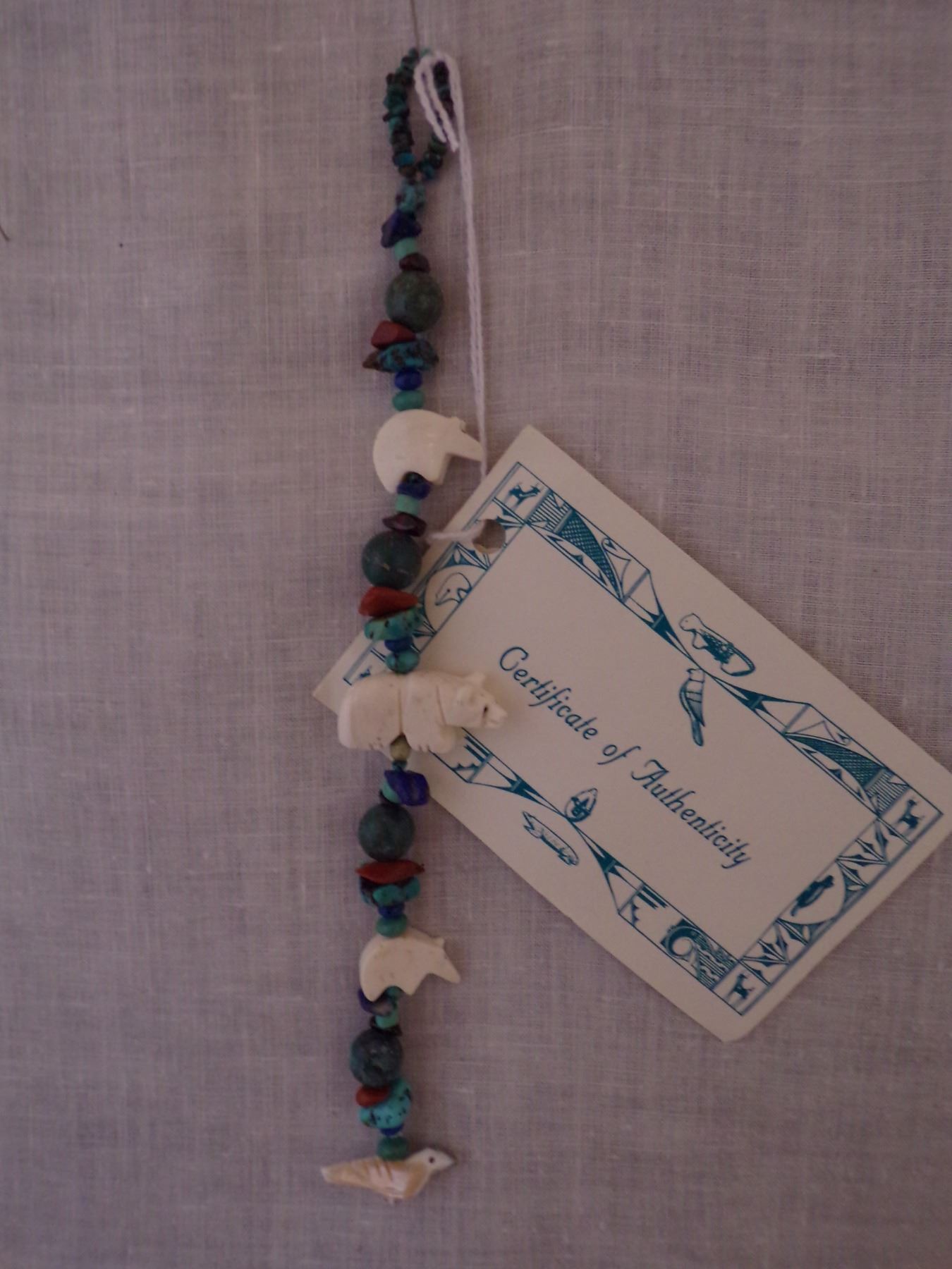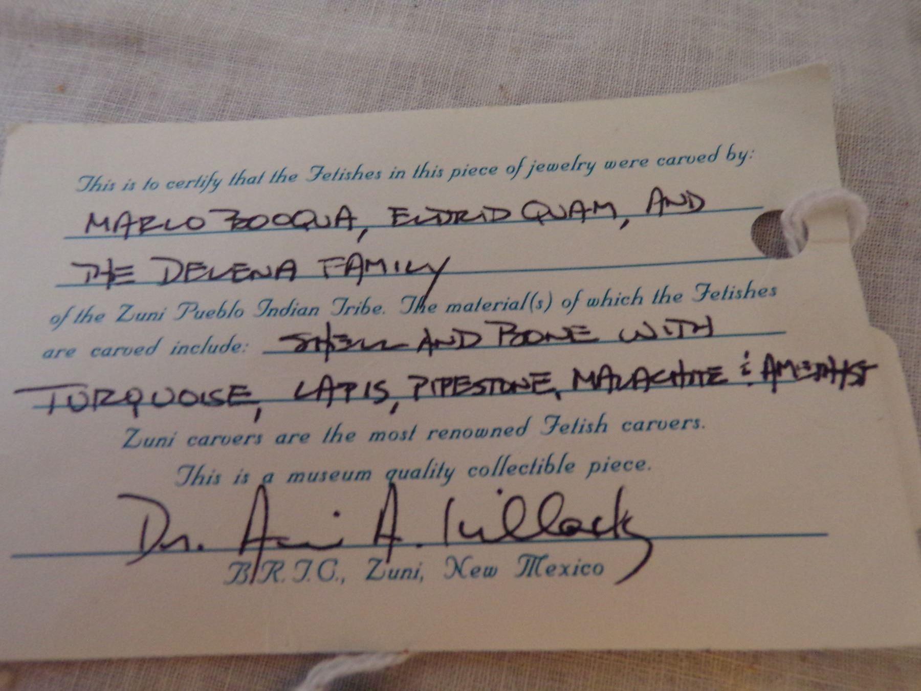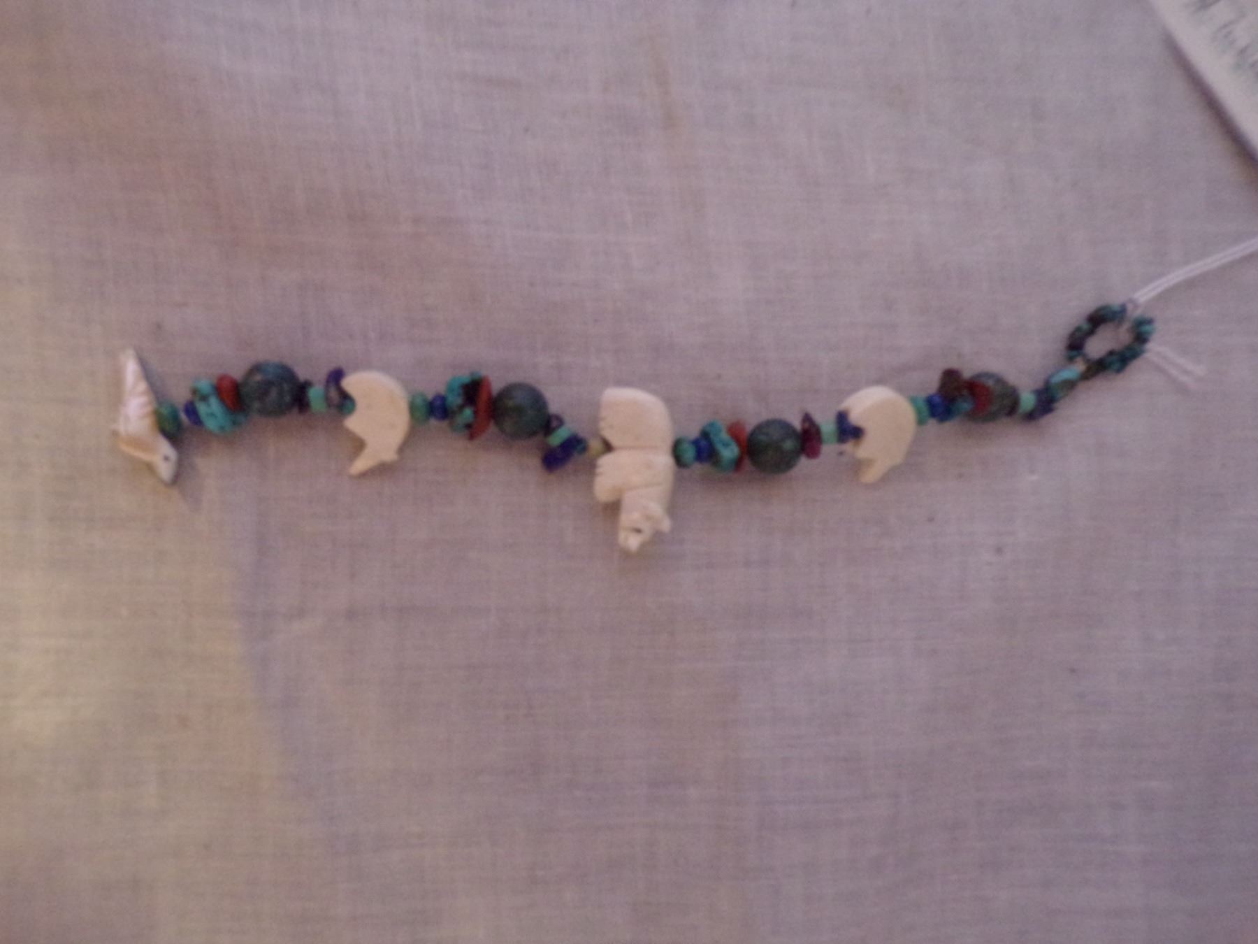 Native American Zuni Beaded Multi-Artist Fetish Bracelet, measures 8''L end to end x 1.25''W, comes with COA, fetishes in this bracelet are by Marlo Booqua, Eldred Quam, and the Devena Family, includes shell, bone, turquoise, lapis, pipestone, malachite, and amethyst