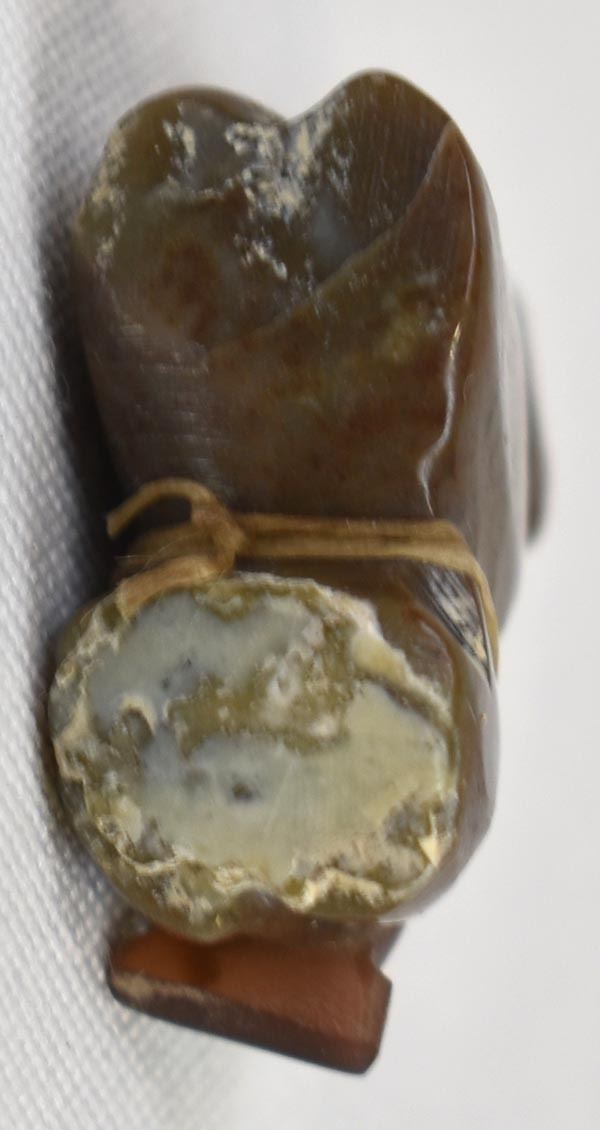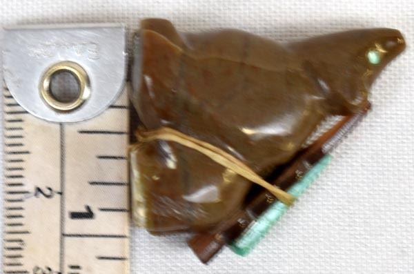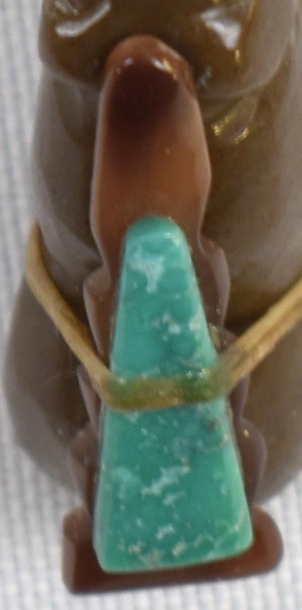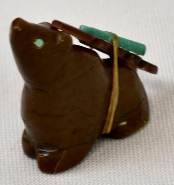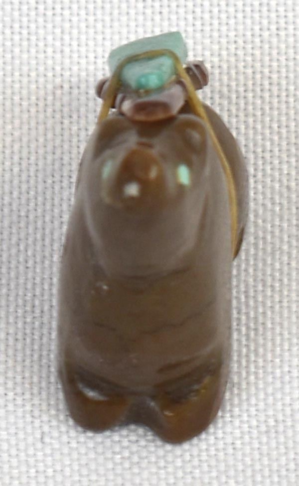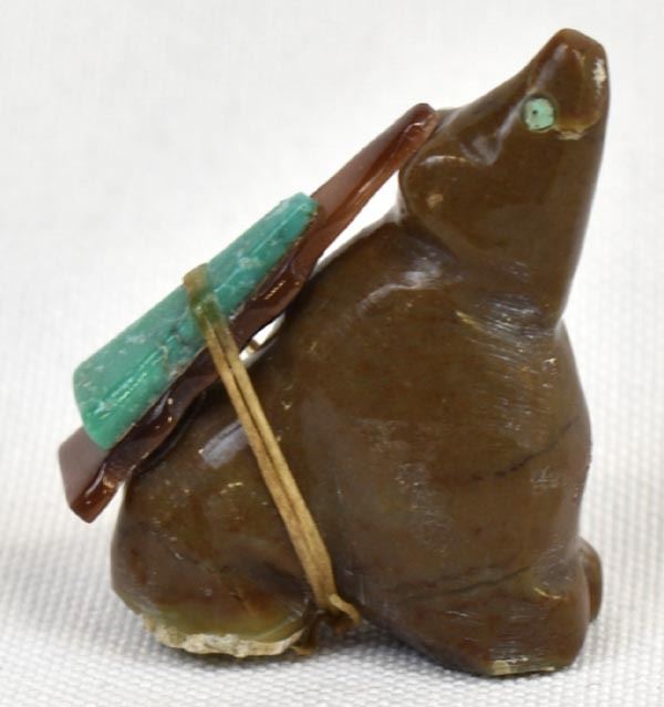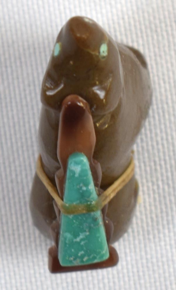 Native American Zuni Bear Fetish by Al Lasiloo, measures 1.25'' x 1'' x .5'', turquoise and shell arrowhead spirit bundle