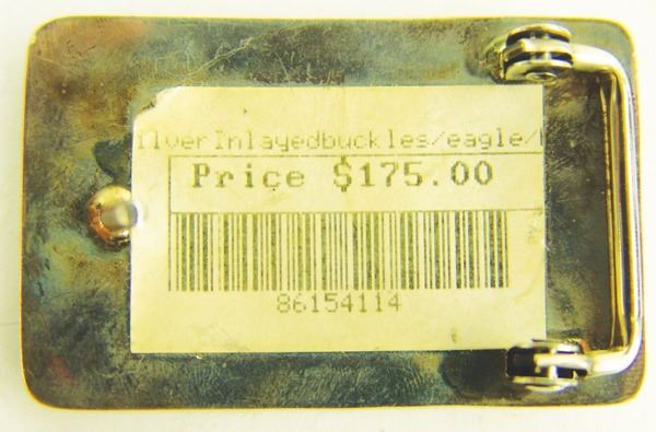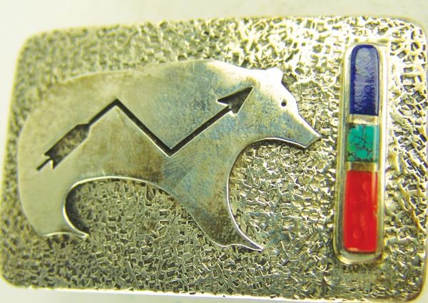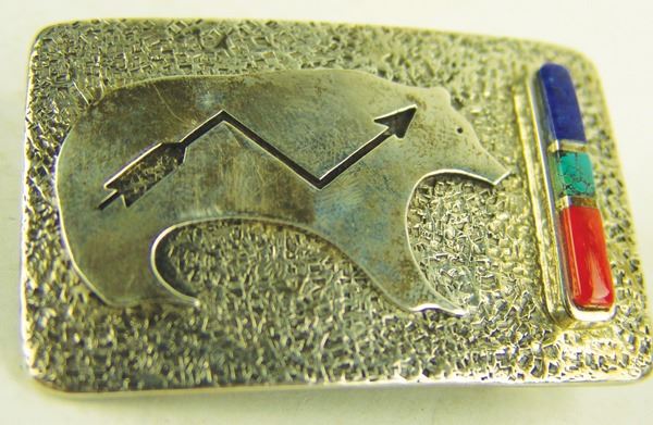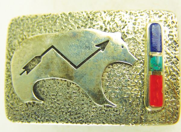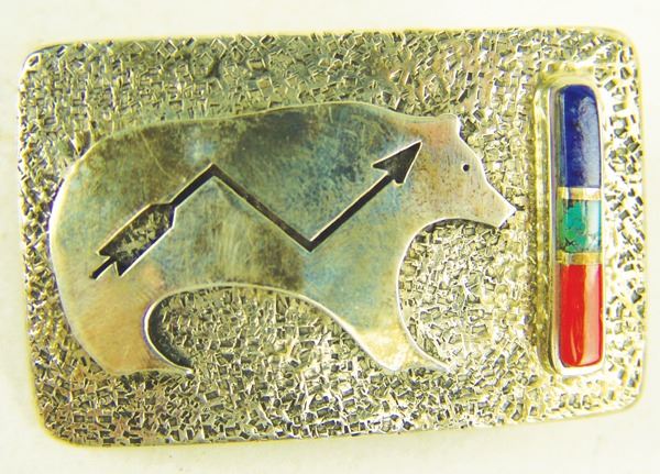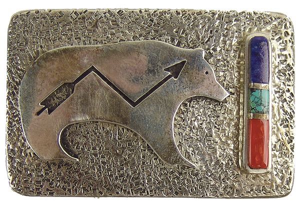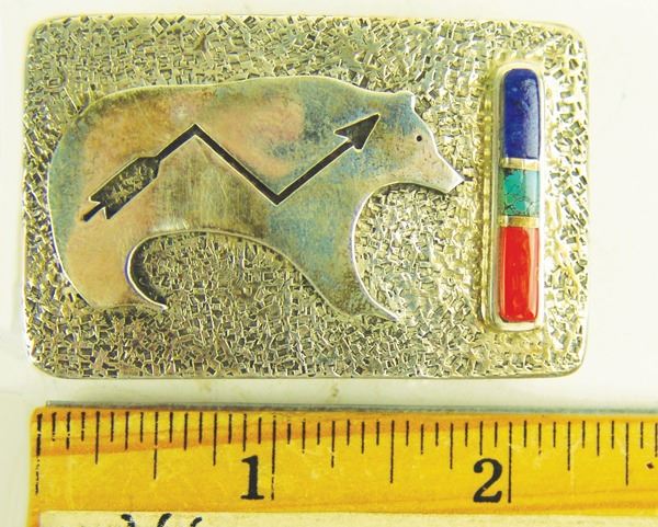 Very fine, contemporary, all silver buckle with heartline bear overlay and inlay bar with turquoise, coral, and lapis stones. Very good condition, signed.Late 1900s1-1/2" x 2-1/2"
