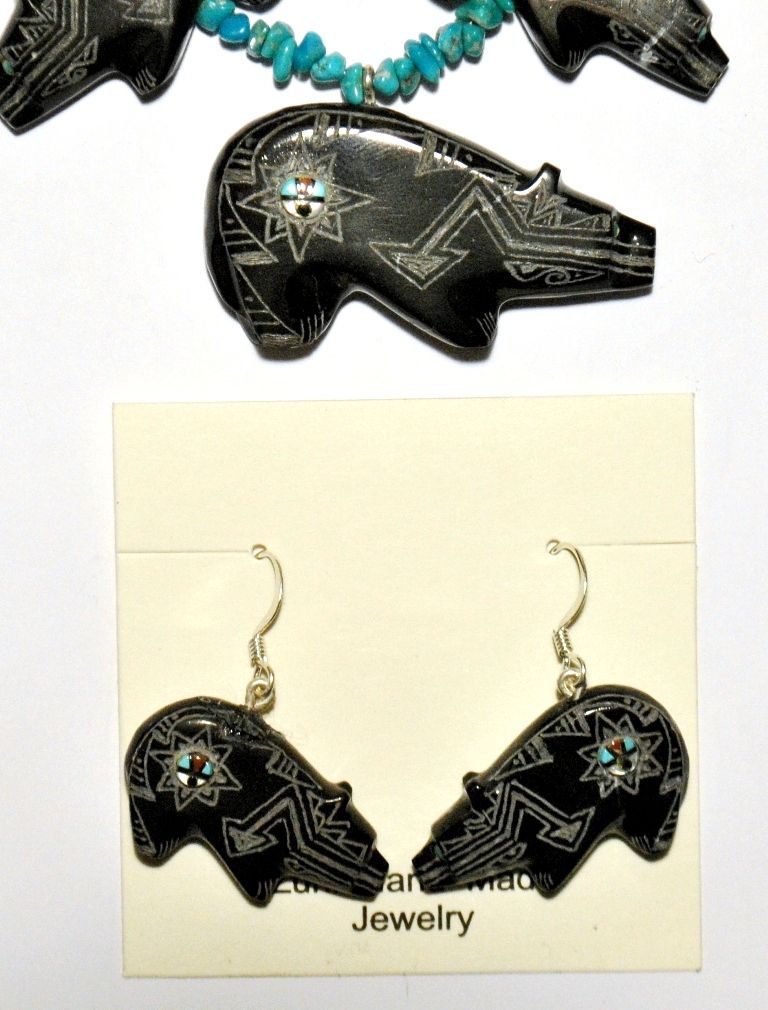 Zuni Black Marble Bear Necklace & Earrings Set - Dilbert Gasper