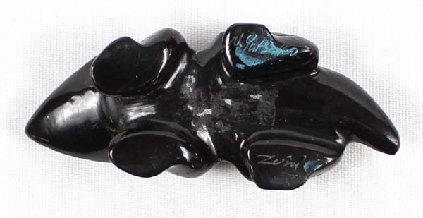 Native American Zuni Black Marble Horned Toad Fetish by Nelson Yatsattie, measures 1'' x .75'' x 2.75'' and is signed on the bottom, turquoise eyes