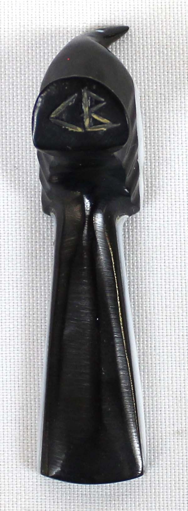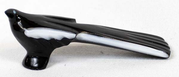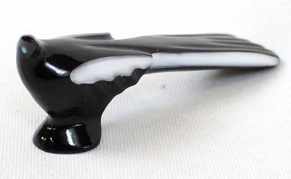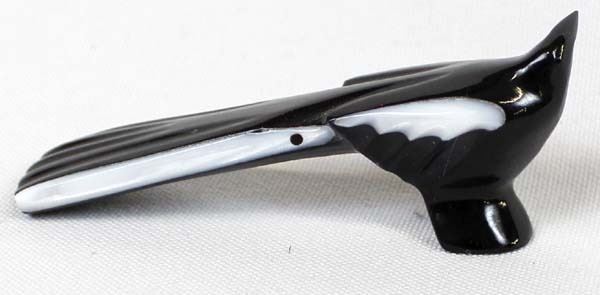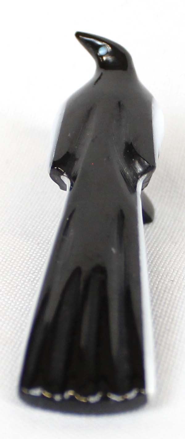 Native American Zuni Black Marble White Wing Raven Fetish by Calvert Bowannie, measures 1'' x 3'' and has artist's initials on the bottom, turquoise eyes