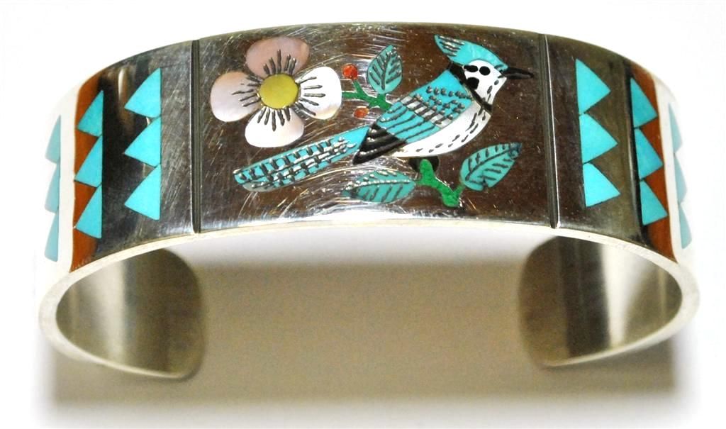 Zuni Blue Bird Inlay Sterling Silver Cuff Bracelet - Rudell & Nancy Laconsello