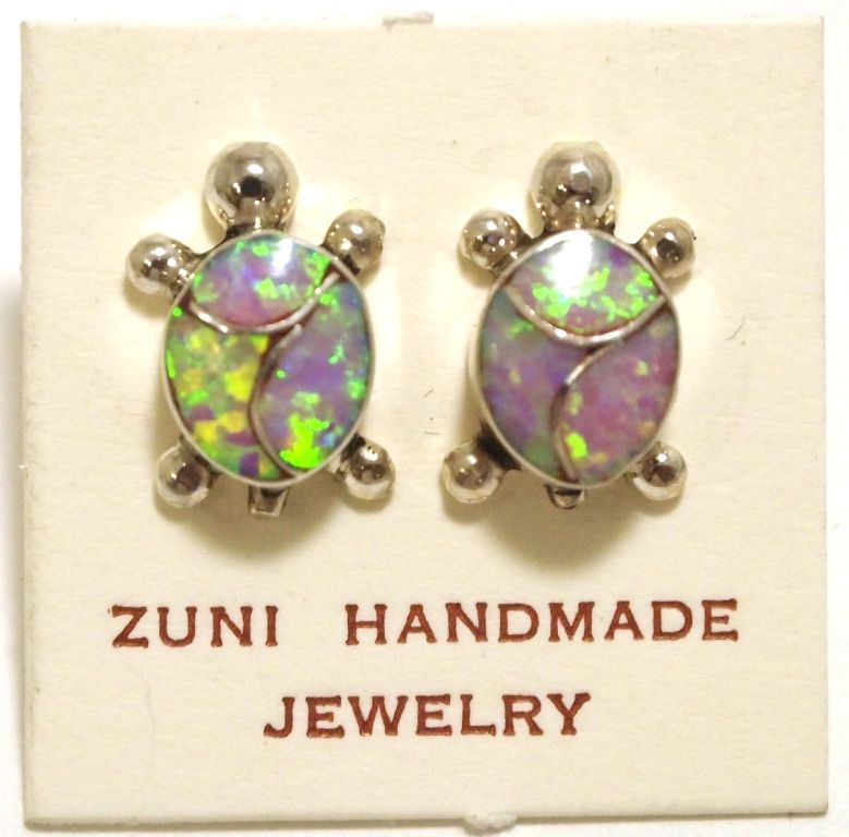Zuni Blue/Green/Pink Opal Inlay Sterling Silver Turtle Post Earrings - Vernon Waikaniwa