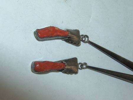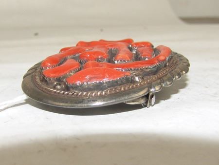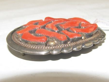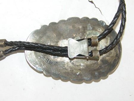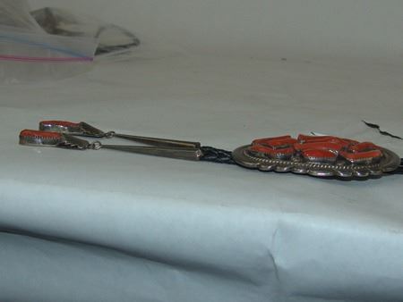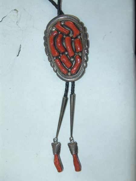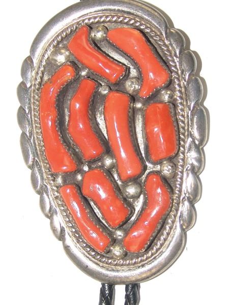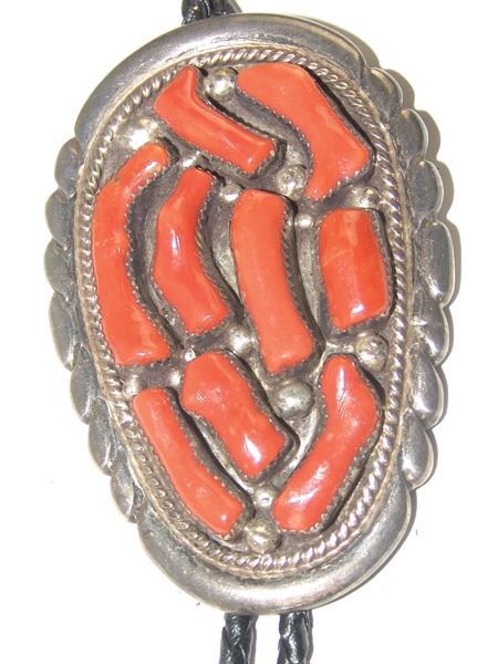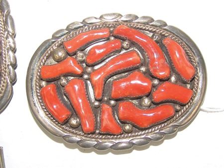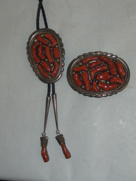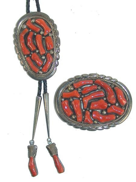 Ca. 1970s, Classic nugget work all-silver belt buckle (3-1/2" x 2-1/2") and matching bolo tie with custom tips laden with beautiful oxblood red coral. Very good condition, great patina. 40" long, bolo 3-1/4" x 2"